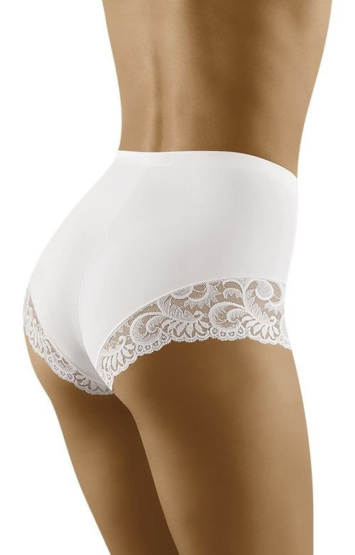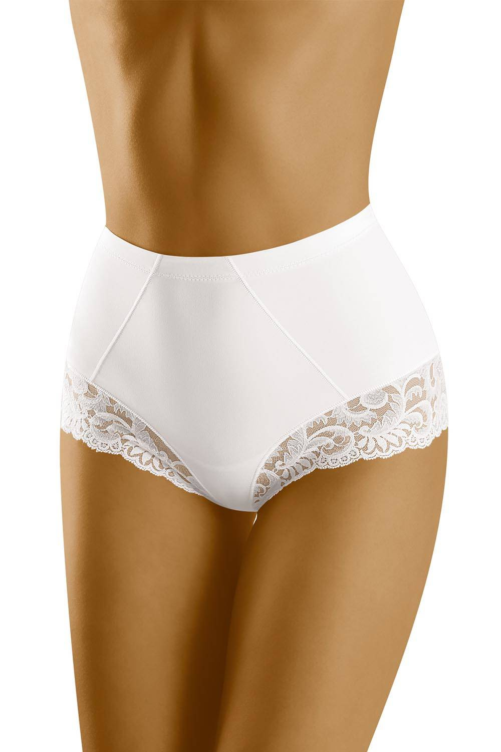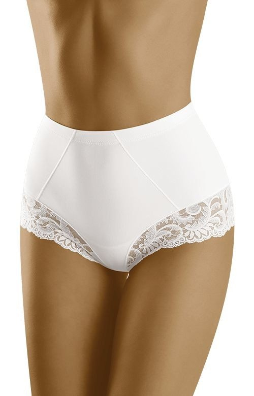 - Korygujące figi z koronką Wolbar - Exepta z podwyższonym stanem, dzięki czemu doskonale układa się na brzuchu i boczkach. Krój majtek jest pełny a ich głównym elementem dekoracyjnym jest urocza koronka wokół ud.