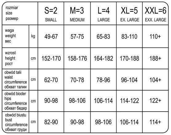Rozmiar | Waga [kg] | Wzrost [cm] | Rozmiar | Obwód Talii | Obwód bioder | Obwód biustu |