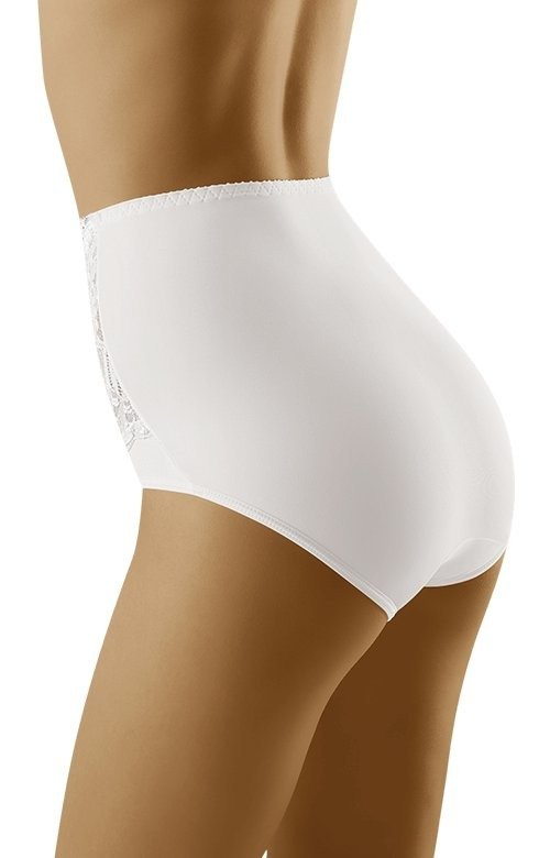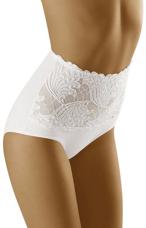 - Modelujące brzuch i talię figi Wolbar - Kaja.Model o wysokim stanie, przód majtek bogato zdobiony koronką w duży roślinny wzór. Pod koronką wszyta jest specjalna elastyczna siatka, której zadaniem jest wzmocnienie efektu modelującego.