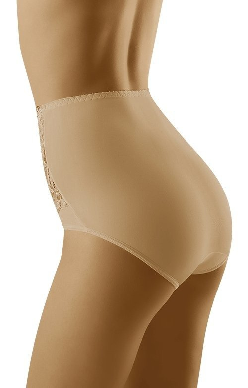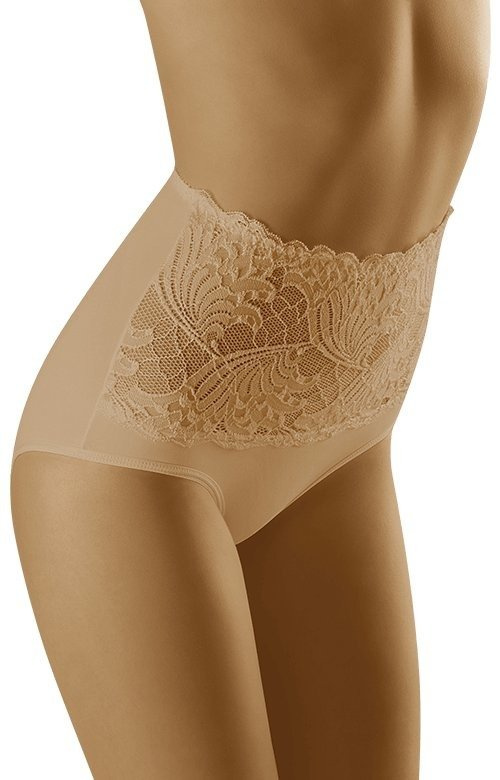 - Modelujące brzuch i talię figi Wolbar - Kaja.Model o wysokim stanie, przód majtek bogato zdobiony koronką w duży roślinny wzór. Pod koronką wszyta jest specjalna elastyczna siatka, której zadaniem jest wzmocnienie efektu modelującego.
