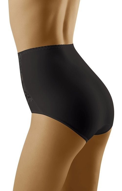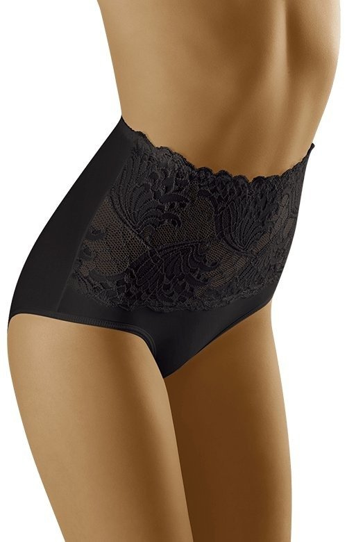 - Modelujące brzuch i talię figi Wolbar - Kaja.Model o wysokim stanie, przód majtek bogato zdobiony koronką w duży roślinny wzór. Pod koronką wszyta jest specjalna elastyczna siatka, której zadaniem jest wzmocnienie efektu modelującego.