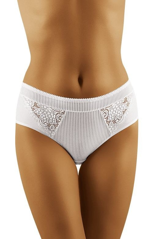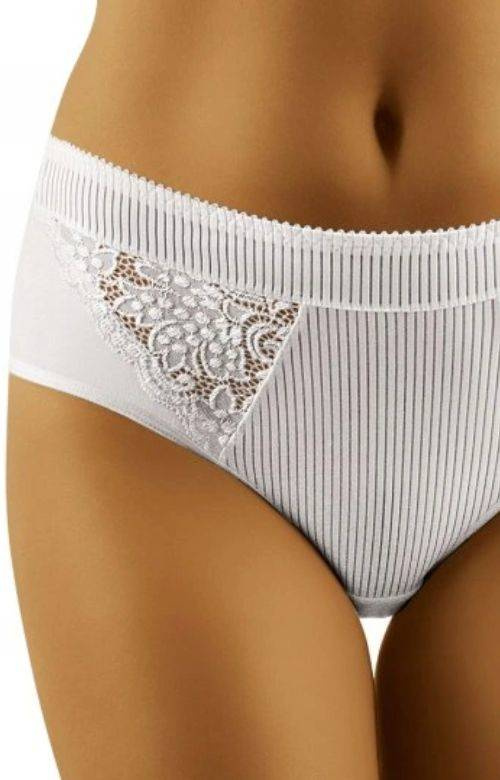 - Figi damskie Wolbar - Eco Fi to Sliczne zabudowanefigi ozdobione w przodu koronką oraz prążkowaną dzianiną. Tył fig jest gładki. Skład materiału: 90% bawełna, 7% elastan (poliuretan), 3% poliamid.