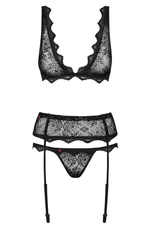 Seksowny i wykwintny komplet – idealny na wieczór we dwoje! 3 części: kuszący stanik, pikantny pas do pończoch oraz stringi. Wszystkie elementy kompletu z gustowną, kwiatową aplikacją i koronkowym wykończeniem!