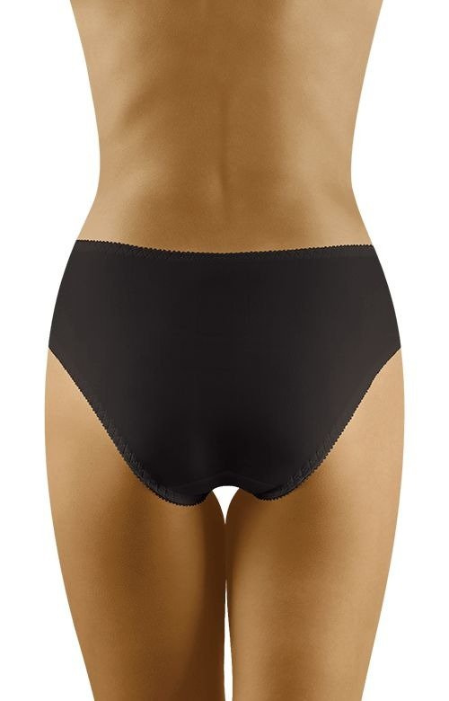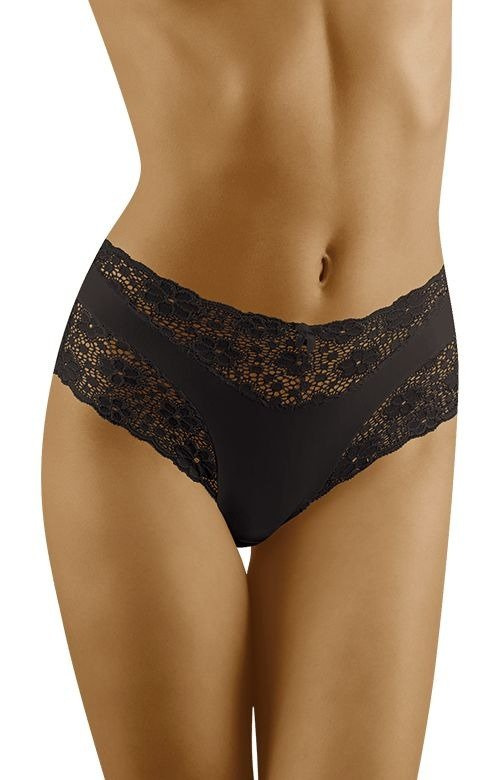 Wolbar MAja to urocze damskie figi typu maxi. Przód fig przy nogawkach oraz pasie zdobi piękna koronka z motywem w kwiatuszki. Tył jest gładki i zabudowany. Majteczki występują w dwóch kolorach: czarnym oraz białym. Wolbar Maja występuje w rozmiarach od S do XL. Skład: MICROFIBRA (Poliamid - 83%, Elastan - 17%).