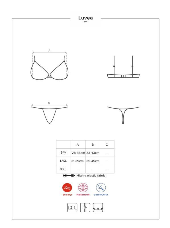 Seksowny koronkowy komplet damski biustonosz ze stringami Obsessive - Luvae. Koronkowy, delikatny biustonosz z fiszbinami, w zestawie ze ślicznie skrojonymi figami, podkreślającymi zalotnie pośladki. Bielizna idealna zarówno na romantyczny wieczór jak i dzień w pracy - cały czas możesz czuć się seksownie i ponętnie. Bardzo kobiecy komplet bielizny. Biustonosz o modnym kroju braletki z regulowanymi ramiączkami i zapięciem. Delikatne fiszbiny zbierają biust i seksownie eksponują dekolt. Przyjemny i elastyczny materiał Multistretch (90% poliamid, 10% elastanSzczegółowe dane