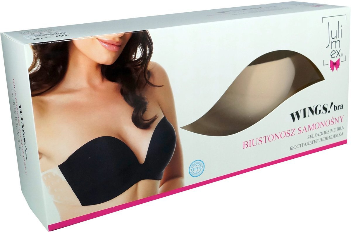 - Samonośny biustonosz Julimex WINGS!BRA. Specjalny biustonosz bez ramiączek i zapięcia z tyłu idealny do sukienek z odkrytymi ramionami i bez pleców. Profilowane miseczki pięknie eksponują biust a transparentne skrzydełka zwiększają lepsze przyleganie.
