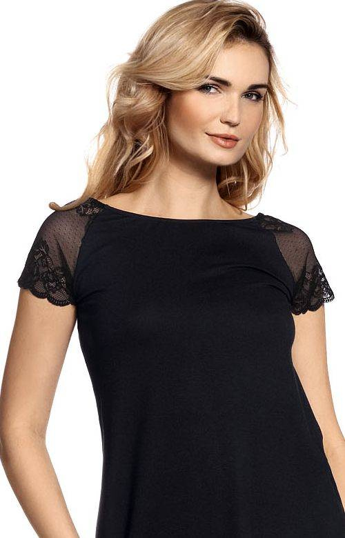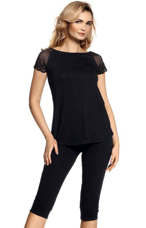 Piżama damska De Lafense - 350 / Estelle. Piżama damska wykonana z wysokiej jakości wiskozy z dodatkiem elastanu. Dekolt w kształcie łódeczki, rękawki zdobi efektowna, ażurowa koronka o kwiatowym motywie. Wygodna piżama ze spodniami 3/4 i kieszeniami.Spodnie typu leggins, długość za kolano. Skład: 94% wiskoza, 6% elastan.Piżama damska De Lafense - 350 / Estelle