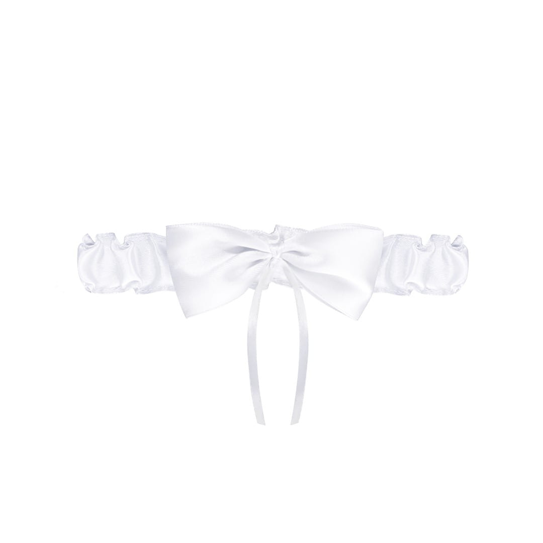 - Skromna satynowa biała podwiązka Julimex PW-52. Podwiązka szyta z satynowej taśmy w odcieniu bieli, ozdobiony pasującą, dużą kokardą.