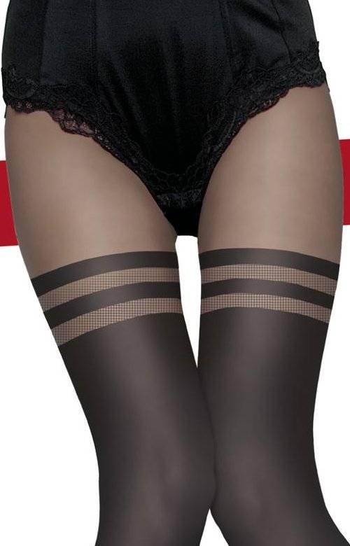 - Fiore DULCINEA rajstopy z wzorem imitującym pończochy. Nogi prezentują się w nich rewelacyjnie a wykończenie wokół ud szerszymi paskami zalotnie przykuwa uwagę.