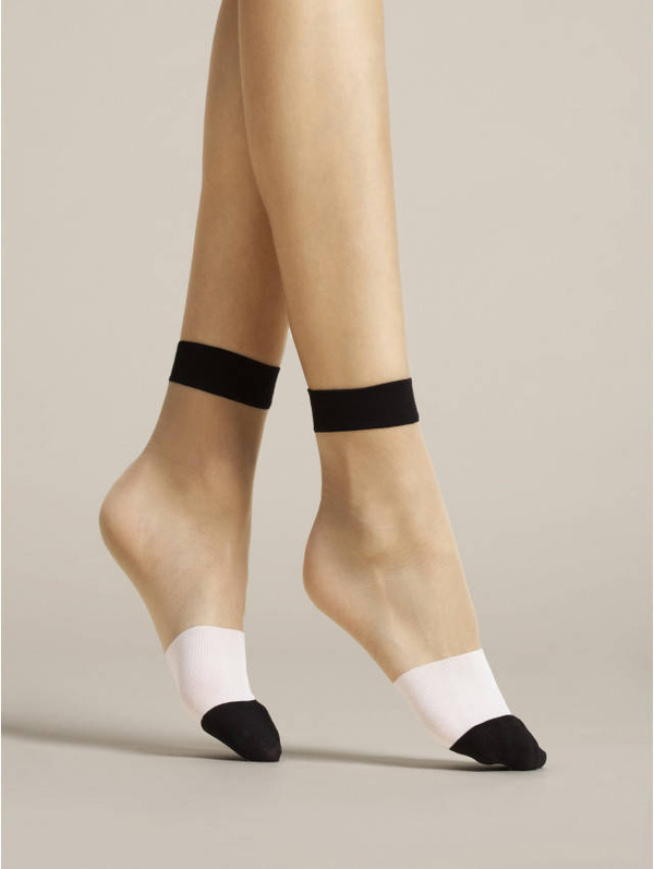 Fiore BICOLORE - transparentne skarpetki rajstopowe z kontrastującym czarnym ściągaczem i czarno białym wykończeniem przy palcach. część palcowa posiada dodatkowe, niewidoczne wzmocnienie. Skład surowcowy: 60% Poliamid, 5% Elastan, 35% Polipropylen.Skarpetki rajstopowe Fiore BICOLORE 15 DEN to doskonałe połączenie elegancji i codziennego komfortu. Wykonane z wysokiej jakości materiałów, te czarno-białe skarpetki stanowią idealny dodatek do każdej stylizacji, podkreślając kobiecość i nowoczesność.