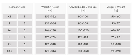 Rozmiar | Wzrost | Obwód bioder | Waga |