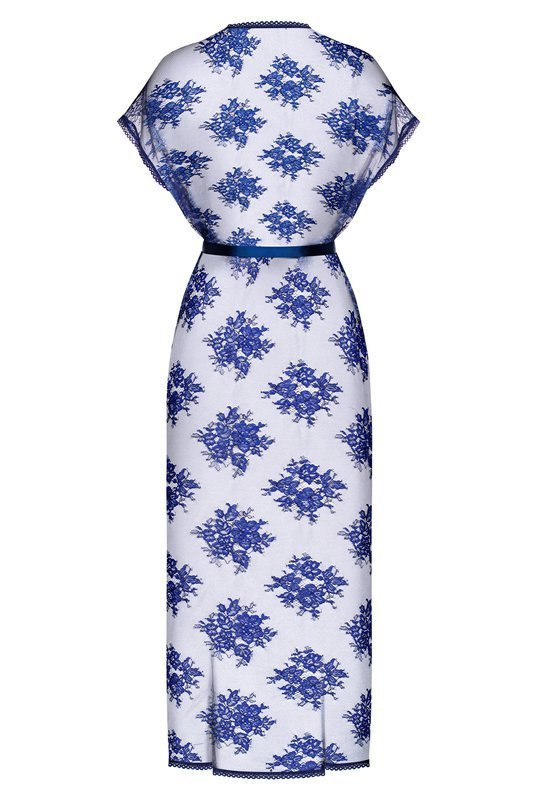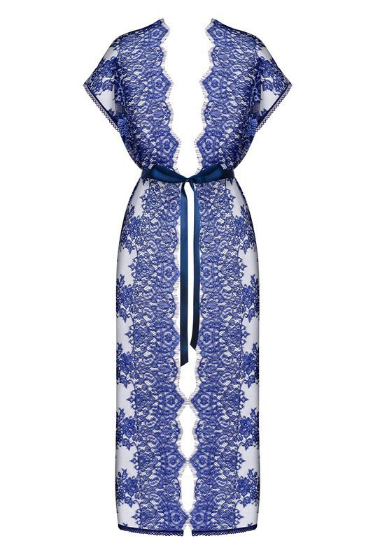 - Niezwykle efektowny koronkowy peniuar Obsessive Flowlace. Załóż go na ciało a efekt będzie piorunujący. Piękna koronka, bogato zdobiona, w intrygującym niebieskim kolorze. Długi koronkowy szlafrok wiązany niebieską, elegancką wstążką.