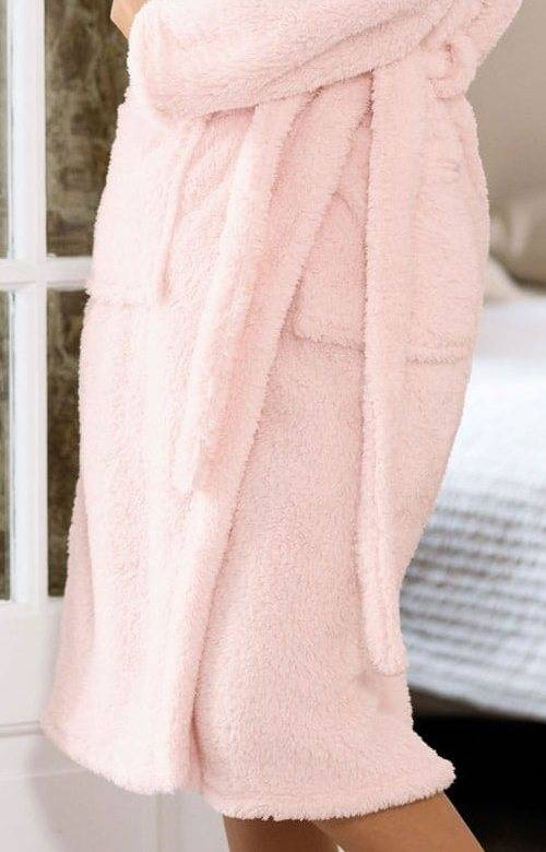 - Różowy ciepły szlafrok damski Unikat JOVITA. Polarowy długi szlafrok, wiązany w pasie z pojemnymi kieszeniami.