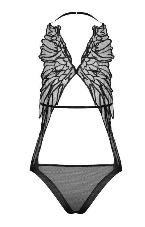- Czarne zmysłowe body z koronkowymi skrzydłami na plecach. Body posiada regulowane ramiączko na szyje dzięki czemu idealnie dopasujemy rozmiar. Miseczki miękkie z marszczeniem.