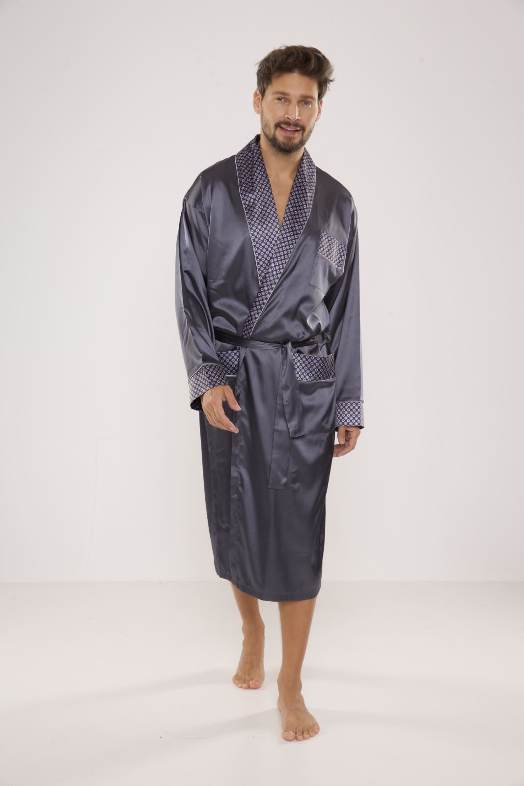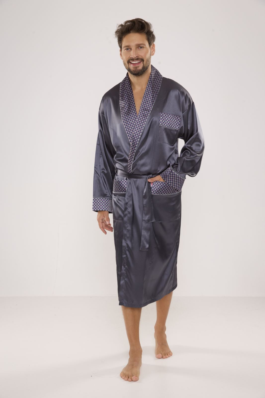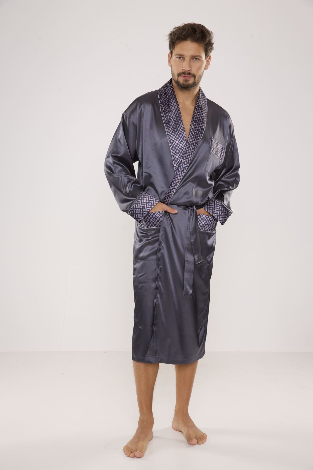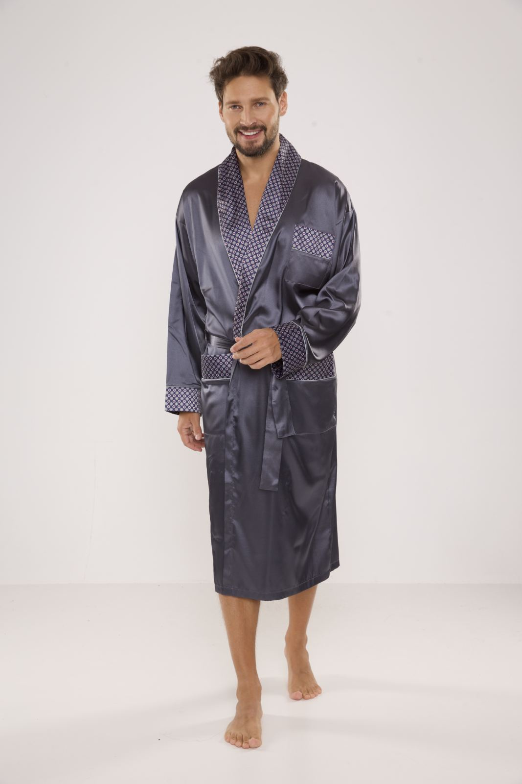 Elegancki satynowy szlafrok męski De Lafense - 940. Długi szlafrok męski, z szalowym kołnierzem, wiązany na pasek, z dwoma naszytymi kieszeniami i jedną mniejszą na wysokości klatki piersiowej. Mankiety, kołnierz i kieszenie wykończone wzorzystą satyną. Bardzo elegancki męski cienki szlafrok z przyjemnego w dotyku materiału o splocie satynowym. Skład 100% poliesterSzary satynowy szlafrok męski De Lafense - 940 to doskonały wybór dla każdego mężczyzny, który ceni sobie komfort i elegancję w domowej garderobie. Wykonany z wysokiej jakości satyny, ten szlafrok łączy w sobie nowoczesny design oraz wyjątkową przyjemność noszenia. Przeznaczony dla mężczyzn, którzy szukają czegoś więcej niż tylko zwykłego szlafroka – to prawdziwa definicja stylowego komfortu.