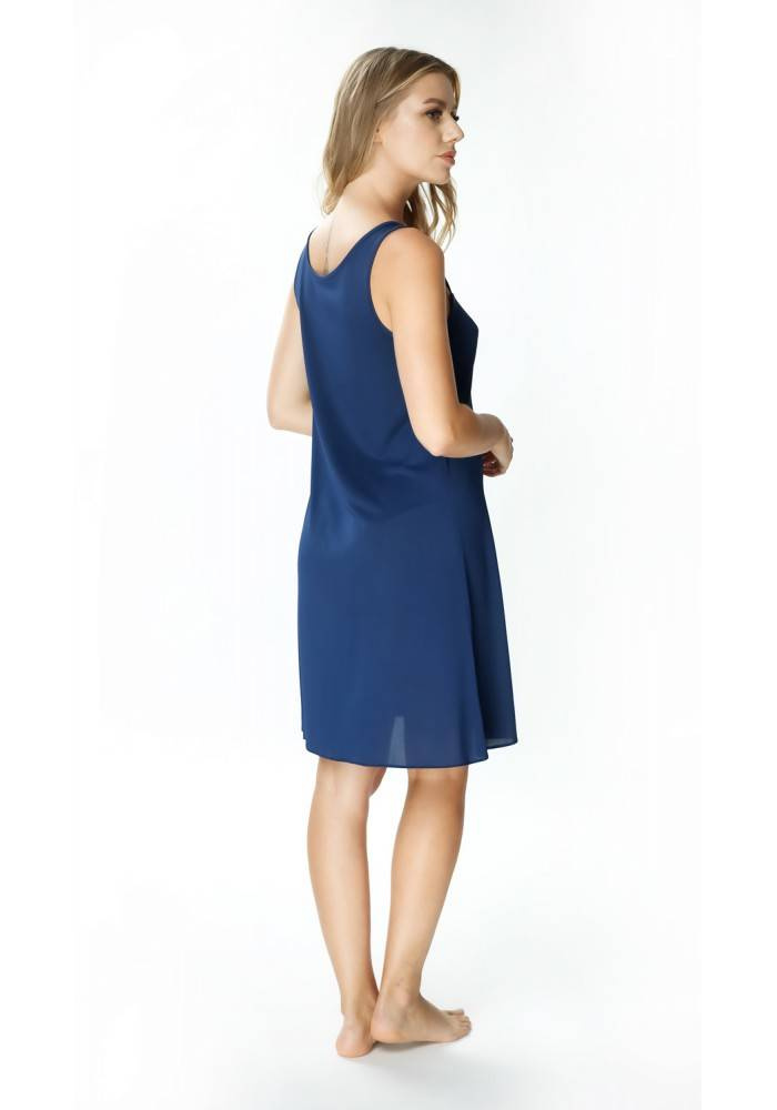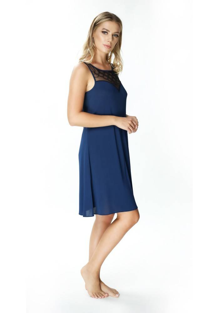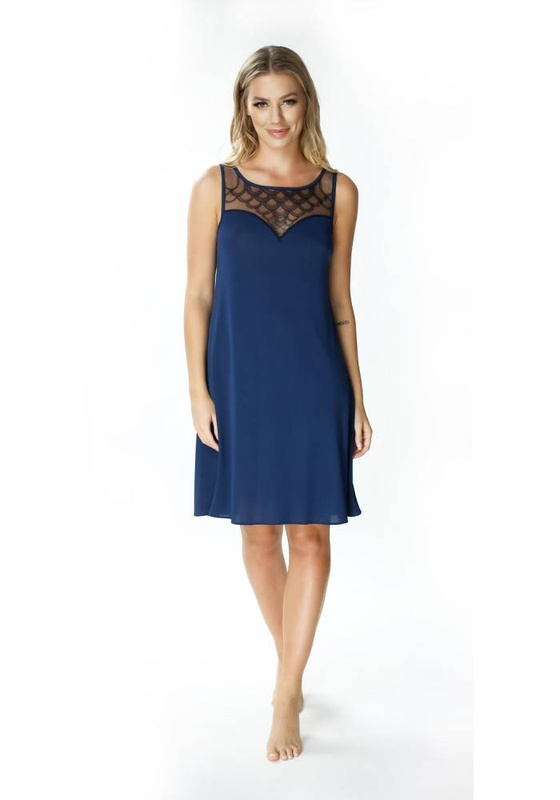 Koszula nocna Evora z ciekawym dekoltem z motywem rybiej łuski, przeplatany miedzianą, lureksową mieniącą się nicią. Dekolt podkreślony został cienką lamówką, która optycznie powiększa piersi. Luźnemu krój świetnie układa się na każdym rodzaju sylwetki. Zalety koszuli nocnej Evora z jedwabiu wiskozowego: nie elektryzuje się nie dokleja się do ciała swobodnie opływa ciało delikatna w dotyku trwała w użytkowaniu oddaje nadmiar ciepła, zapobiegając przegrzewaniu się ciała - idealna na lato zapobiega powstawaniu nieprzyjemnych zapachów - jest antybakteryjna chroni przed poceniem, oddając wilgoć na zewnętrzną warstwę jedwab wiskozowy jest bezpieczny dla alergików, nie uczula ani nie podrażnia skóry.Jedwabna koszula nocna z ozdobnym dekoltem Mewa 6281 Evora to doskonała propozycja dla kobiet, które cenią sobie elegancję i wygodę podczas snu. Wykonana z jedwabiu wiskozowego Vistex, ta koszula nocna zapewnia przyjemne doznania dotykowe oraz doskonałą przewiewność. Granatowy kolor dodaje jej niezwykłego blasku, a subtelne detale sprawiają, że staje się prawdziwą ozdobą garderoby nocnej.
