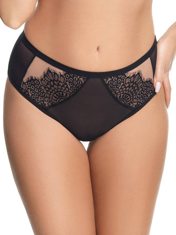 - Tiulowe brazyliany z ozdobną koronką z przodu Gorsenia K679 RAVENNA. Majtki szyte z podwójnie złożonego tiulu od spodu beżowego a na wierzchu czarnego. Tył zdobi mała trójkątna wstawka z mikrofibry umieszczona nad pośladkami.