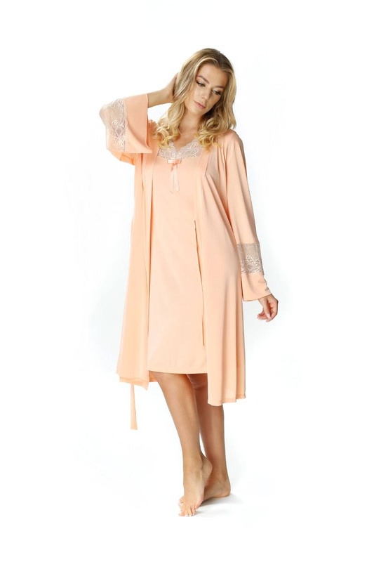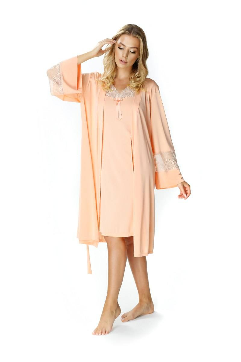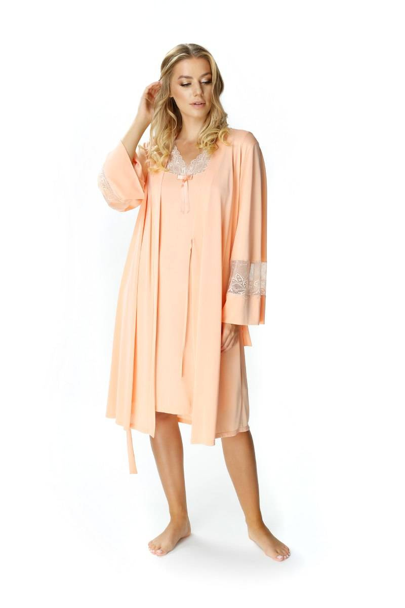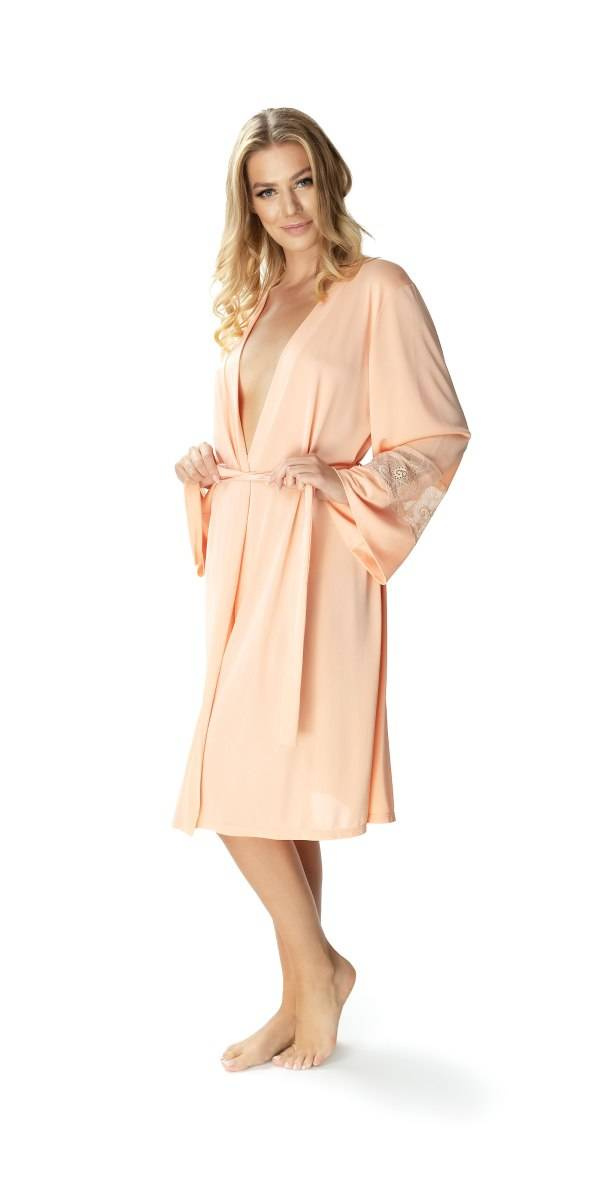 Jedwabny szlafrok peniuar Mewa 6375 Paula. Szlafrok długości okolic kolan, wiązany w pasie. Długi rękaw z koronkową wstawką . Wykonany z jedwabiu wiskozowego, który cechuje termoaktywność, higroskopijność, hipoalergiczność. Skład: 72% wiskozy, 28% poliamidu.Odkryj jedwabny szlafrok peniuar Mewa 6375 Paula, idealny wybór dla kobiet ceniących sobie luksus i komfort. Wykonany z jedwabiu wiskozowego Vistex, ten szlafrok damski w kolorze morelowym zapewnia niesamowitą lekkość i przewiewność. Doskonały na letnie wieczory, odznacza się subtelnym dekoltem w kształcie szpica oraz eleganckimi detalami, takimi jak koronka lub haft. Dzięki szerokiemu zakresowi rozmiarów, w tym dużym rozmiarom, każda kobieta może poczuć się wyjątkowo i zmysłowo. To nowość w kategorii szlafroków damskich jedwabnych, która z pewnością przyciągnie uwagę miłośniczek ekskluzywnej bielizny nocnej.
