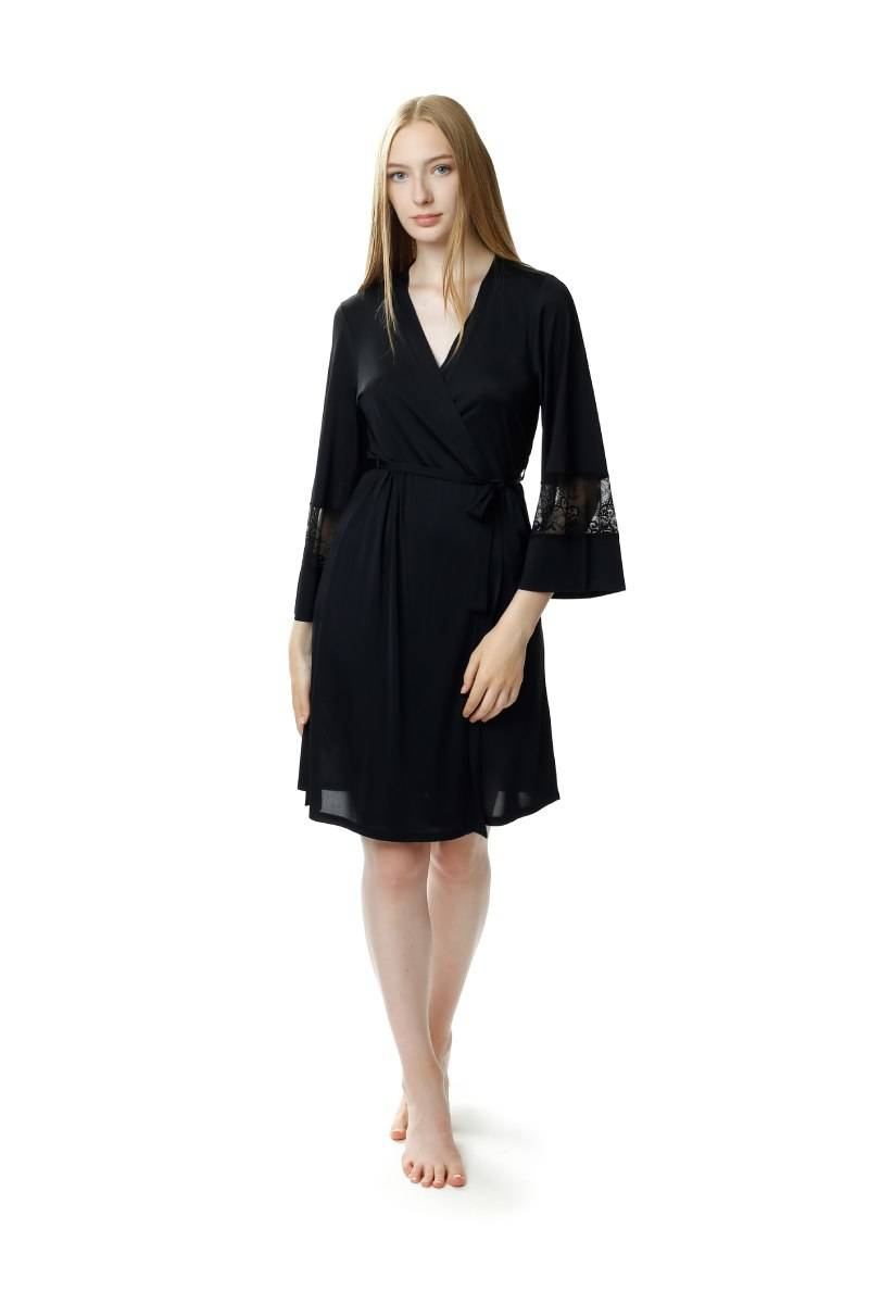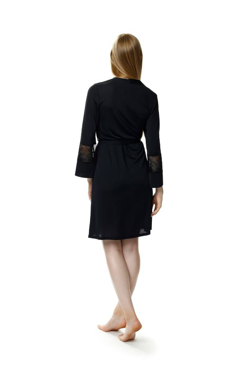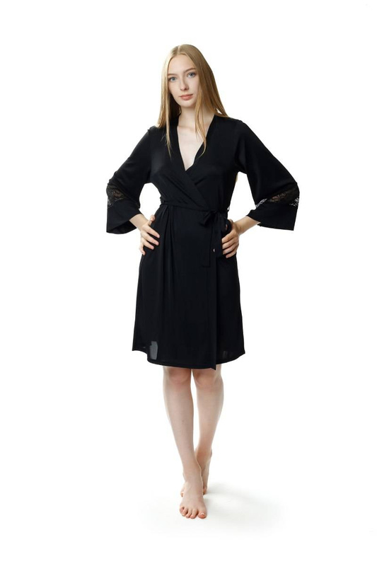 Jedwabny szlafrok peniuar Mewa 6375 Paula. Szlafrok długości okolic kolan, wiązany w pasie. Długi rękaw z koronkową wstawką . Wykonany z jedwabiu wiskozowego, który cechuje termoaktywność, higroskopijność, hipoalergiczność. Skład: 72% wiskozy, 28% poliamidu.Odkryj niezwykły jedwabny szlafrok peniuar Mewa 6375 Paula, który zachwyca swoją elegancją i wygodą. Ten ekskluzywny szlafrok damski w klasycznym czarnym kolorze to idealne połączenie stylu i komfortu, dzięki czemu poczujesz się pięknie i wyjątkowo w każdej chwili. Wykonany z jedwabiu wiskozowego Vistex, łączy w sobie zalety szlafroków damskich letnich i cienkich, co sprawia, że jest doskonały na cieplejsze dni. Bogato zdobiony koronką lub haftem oraz z eleganckim dekoltem szpic, jest to model, który z pewnością podkreśli Twoją kobiecość.