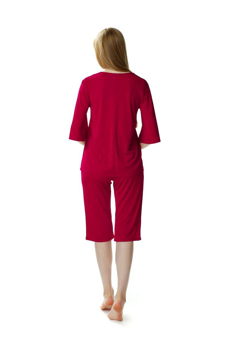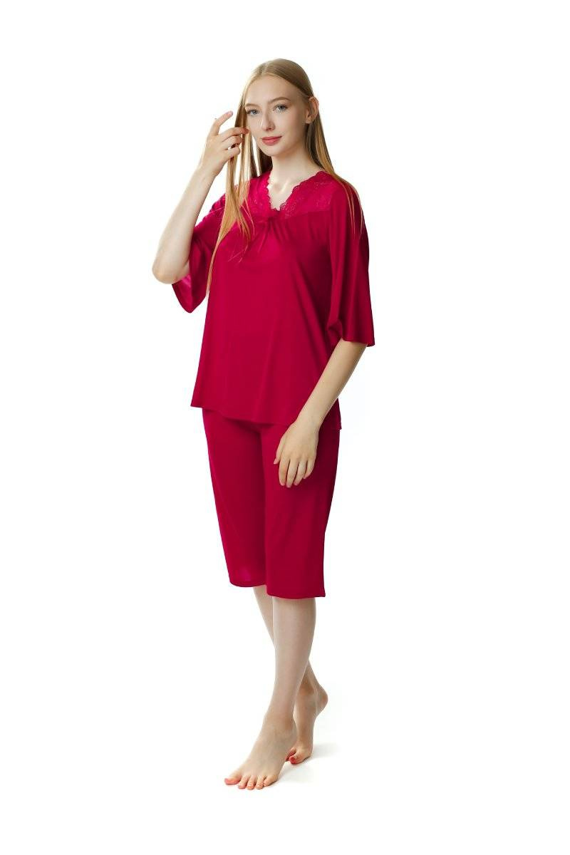Dwuczęściowa jedwabna piżama damska Mewa 6377 Dagmara. Bluzka piżamy luźna z rękawem 3/4, dekoltem w szpic i koronką nad dekoltem. W komplecie gładkie spodnie o długości 3/4. Piżama Dagmara została wykonana z jedwabiu wiskozowego, który jest materiałem ekologicznym, higroskopijnym, oddychającym, doskonale przepuszczającym powietrze. Jedwab wiskozowy ceniony jest również za wysoką wytrzymałość i odporność na uszkodzenia mechaniczne. Ponadto jedwab wiskozowy wykazuje również właściwości antyalergiczne i antybakteryjne, dlatego nasze piżamy sprawdzą się również dla osób o wrażliwej i delikatnej skórze.Dwuczęściowa jedwabna piżama damska Mewa 6377 Dagmara to idealny wybór dla każdej kobiety, która ceni sobie wygodę i elegancję w nocy. Ta piżama damska jednokolorowa w eleganckim burgundowym kolorze doskonale sprawdzi się zarówno w chłodniejsze noce, jak i podczas romantycznych wieczorów. Wykonana z wysokiej jakości jedwabnego wiskozy Vistex, piżama oferuje wyjątkowy komfort noszenia oraz doskonałą oddychalność. Zmysłowy dekolt w kształcie szpica doskonale podkreśla kobiecą linię szyi, natomiast 3/4 rękawy dodają całości subtelności. Model ten dostępny jest w dużych rozmiarach, co sprawia, że każda kobieta może poczuć się w nim pięknie i komfortowo.