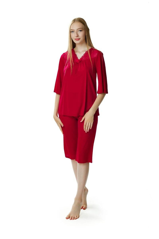 - Dwuczęściowa jedwabna piżama damska Mewa 6377 Dagmara. Bluzka piżamy luźna z rękawem 3/4, dekoltem w szpic i koronką nad dekoltem. W komplecie gładkie spodnie o długości 3/4.