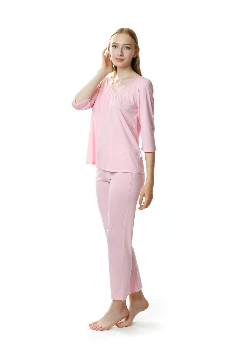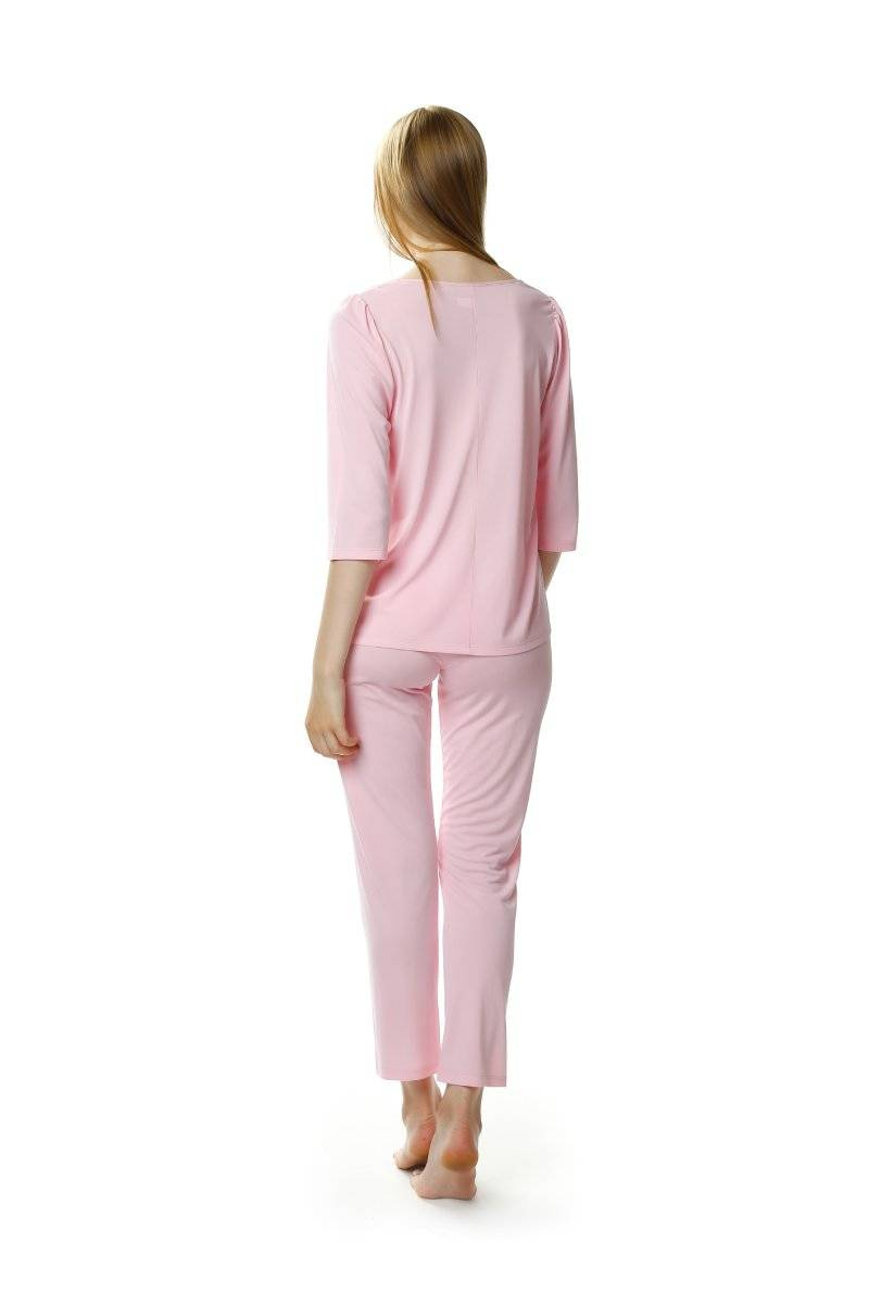 - Dwuczęściowa piżama damska Mewa 6202 Vivien. Posiada bluzkę z rękawem o długości 3/4 i ozdobną koronkową wstawką na dekolcie oraz długie klasyczne spodnie. Szyta z jedwabiu wiskozowego, który jest miękki, delikatny, nie uczula i przepuszcza powietrze.