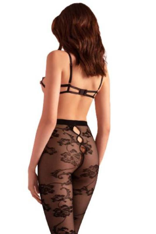 Intrygujące rajstopy ze zmysłowymi łezkami na linii pośladków. Rajstopy w bogate, roślinne motywy kuszą i zapraszają do miłosnej gry, do dalszego poznawania.