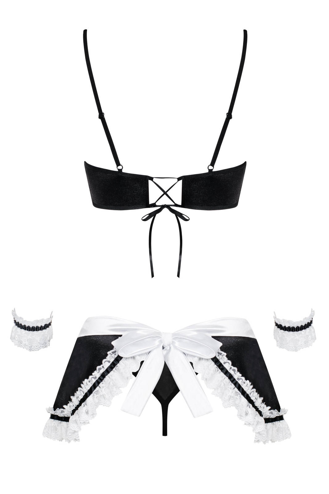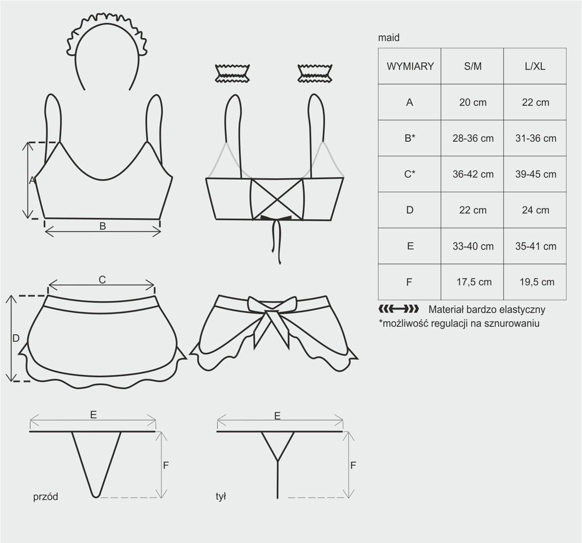 Uroczy kostium pokojówki! Spełnij najskrytsze pragnienia swojego partnera! gustowny, delikatnie połyskujący materiał sznurowany z tyłu top idealnie dopasowuje się do każdej figury! króciutka spódniczka wiązana z tyłu dużą zalotną kokardą – 100% pikanterii całość zdobiona biała koronką zestaw zawiera: top, spódniczkę, stringi, koronkowe mankiety oraz opaskę komplet nie zawiera miotełki przyjemny w dotyku materiał dodaje całości elegancji i pięknie dopasowuje się do kształtów ciała delikatny materiał (90% polamid, 10% elastan)Szczegółowe dane