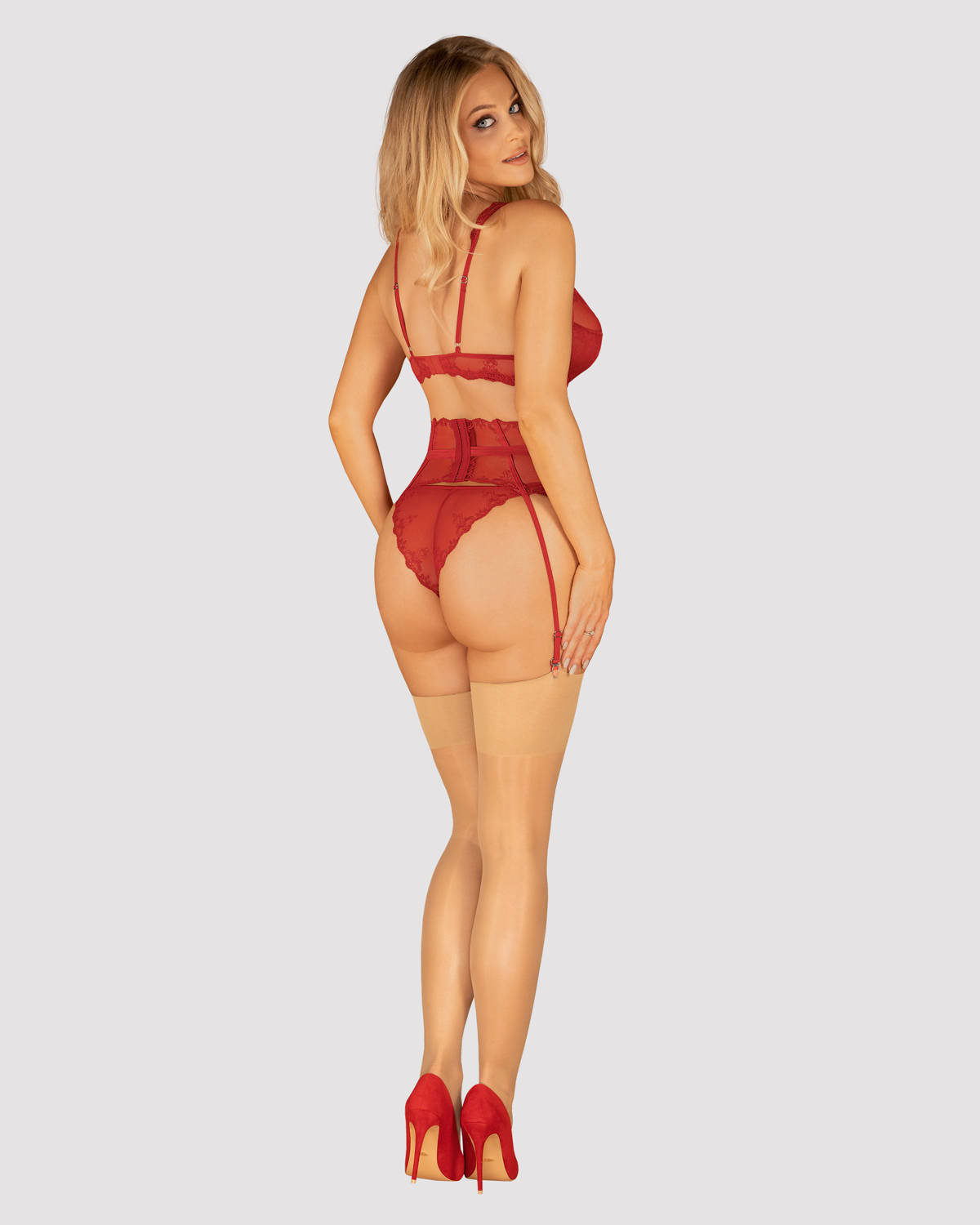 Obsessive Lonesia to efektowny pas do pończoch szyty z czerwonego prześwitującego materiału ozdobionego urokliwym haftem. Pas posiada wyższy stan lekko modelujący sylwetkę. Dodatkowo model Lonesia posiada wygodne zapięcie na haftki umieszczone z tyłu, bardzo kobiecy krój, regulowane paski do pończoch oraz biżuteryjną ozdobna zawieszkę z przodu. Skład: miły w dotyku materiał (60% poliester, 40% poliamid).Szczegółowe dane