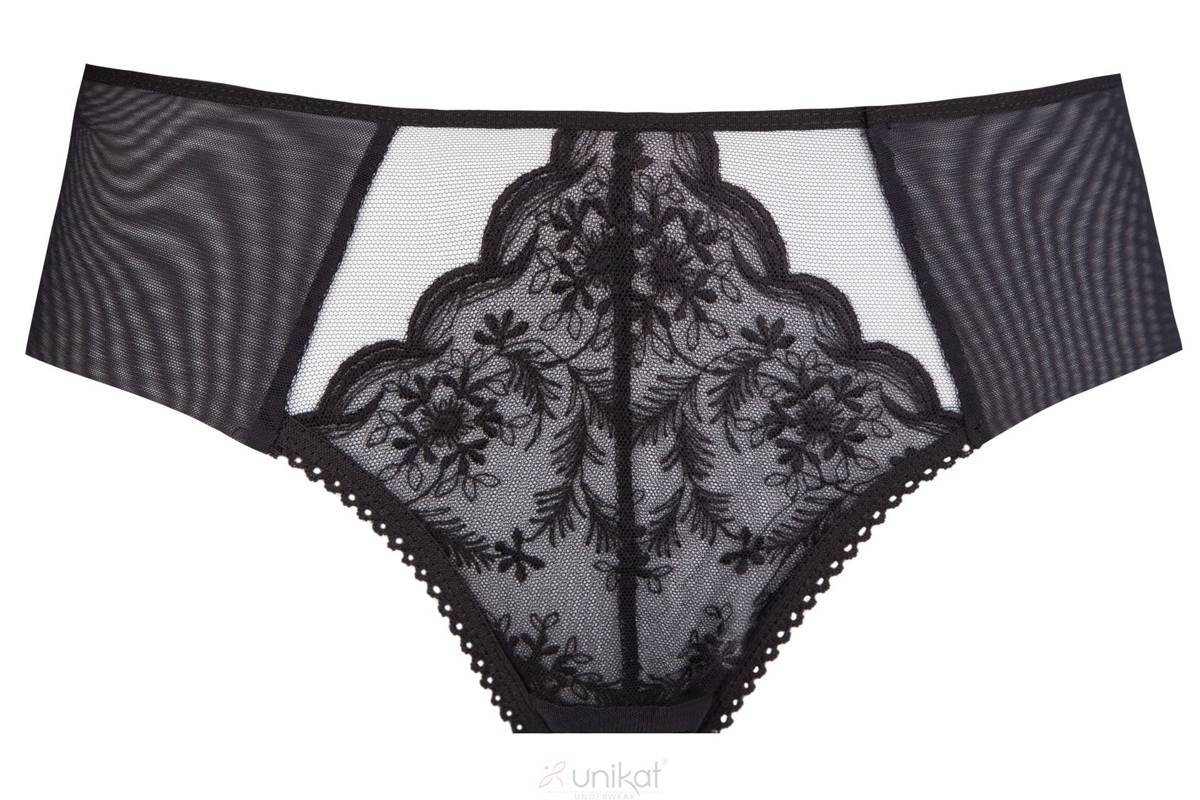Unikat KENZA - te niesamowicie eleganckie stringi w całości uszyto z czarnego elastycznego tiulu. Przód zdobi wstawka z koronki o motywie roślinnym. Dzięki szerszym boczkom stringi idealnie otulają i układają się na ciele.Odkryj wyjątkowy styl z tiulowymi stringami KENZA od marki Unikat!