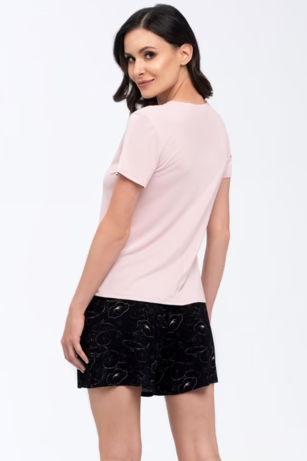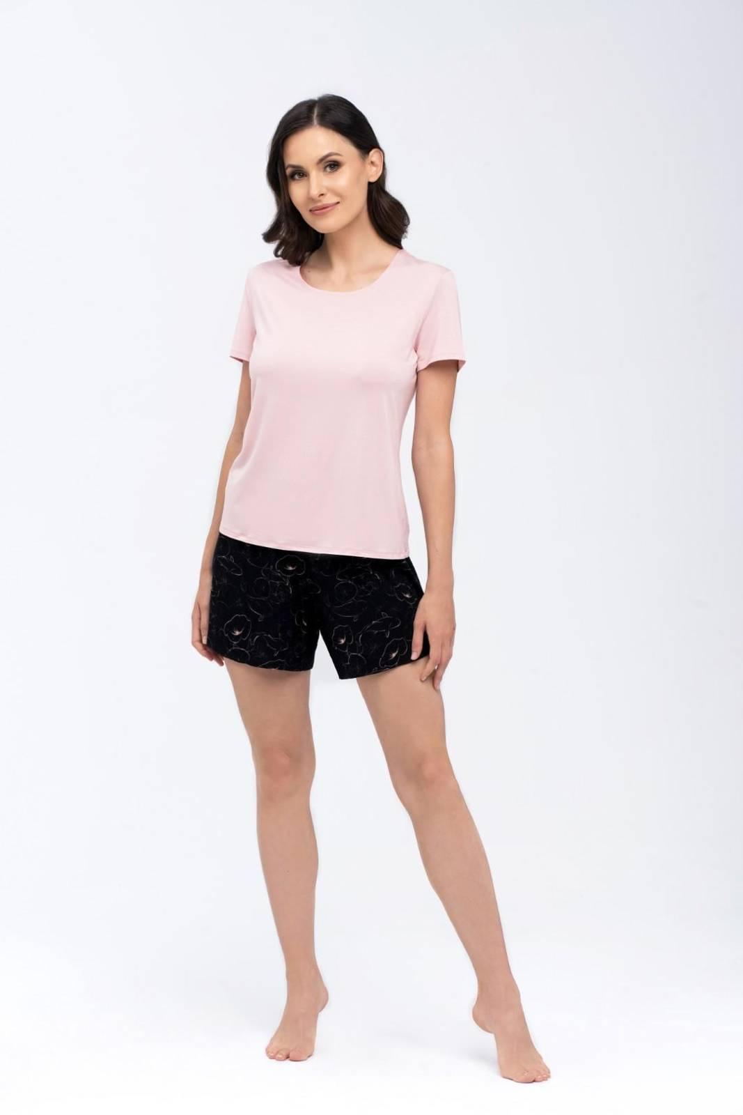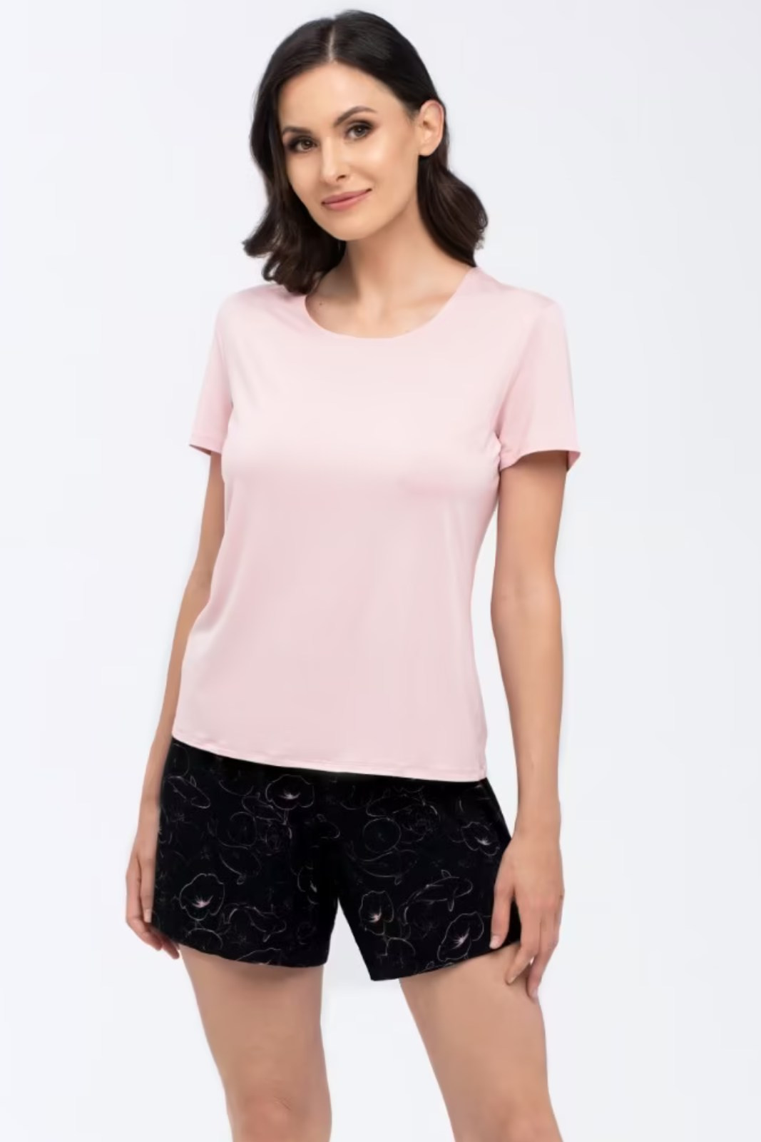 Wiskozowa piżama damska Babella KOI PRINT. W skład tej dwuczęściowej piżamki wchodzi koszulka z krótkim rękawem i krótkie spodenki. Koszulka gładka z okrągłym dekoltem o luźniejszym kroju nie krępującym ruchów. Dół piżamki czarny ozdobiony delikatnym różowym nadrukiem. Skład: 94% wiskoza, 6% elastan.Szczegółowe dane
