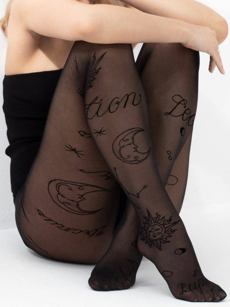 - Cienkie czarne rajstopy ozdobione wzorami i symbolami gwieździstego nieba.