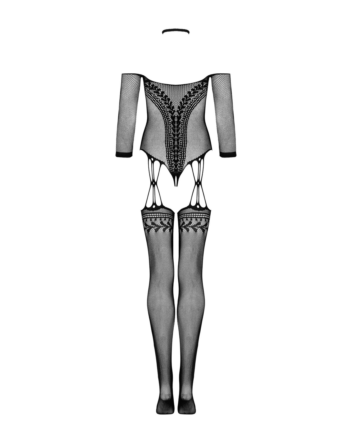 Obsessive G333 - czarny siateczkowy bodystocking stanowiący ciekawe połączenie body i pończoch. Model posiada rękaw długości 3/4, głęboko wycięty dekolt na plecach i otwarty krok. Bodystocking jest elastyczny, idealnie dopasowuje się do sylwetki i jest zakładany przez szyję. Skład: 90% nylon, 10% elastan.Szczegółowe dane