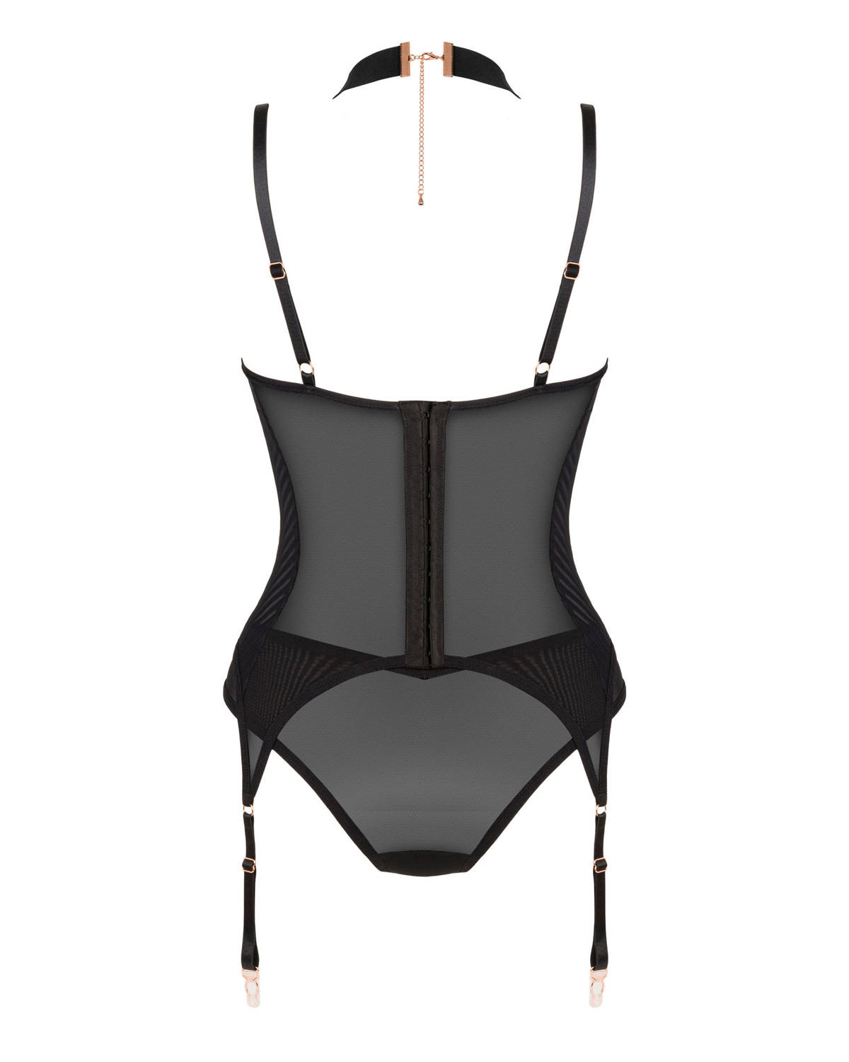 Minimalistyczny gorset Brasica zawiera piękne dodatki w odcieniu różowego złota. Ozdobne paseczki po bokach podkreślają talię, gorset uszyty z delikatnej siateczki. Całość uzupełnia zmysłowy choker oraz figi. Pasek od chokera może być odpinany. Gorset ma miseczki z fiszbinami, które pięknie wyeksponują piersi. Gorset z regulowanymi ramiączkami i z paskami do pończoch. Skład: 90% poliamid, 10% elastanSzczegółowe dane