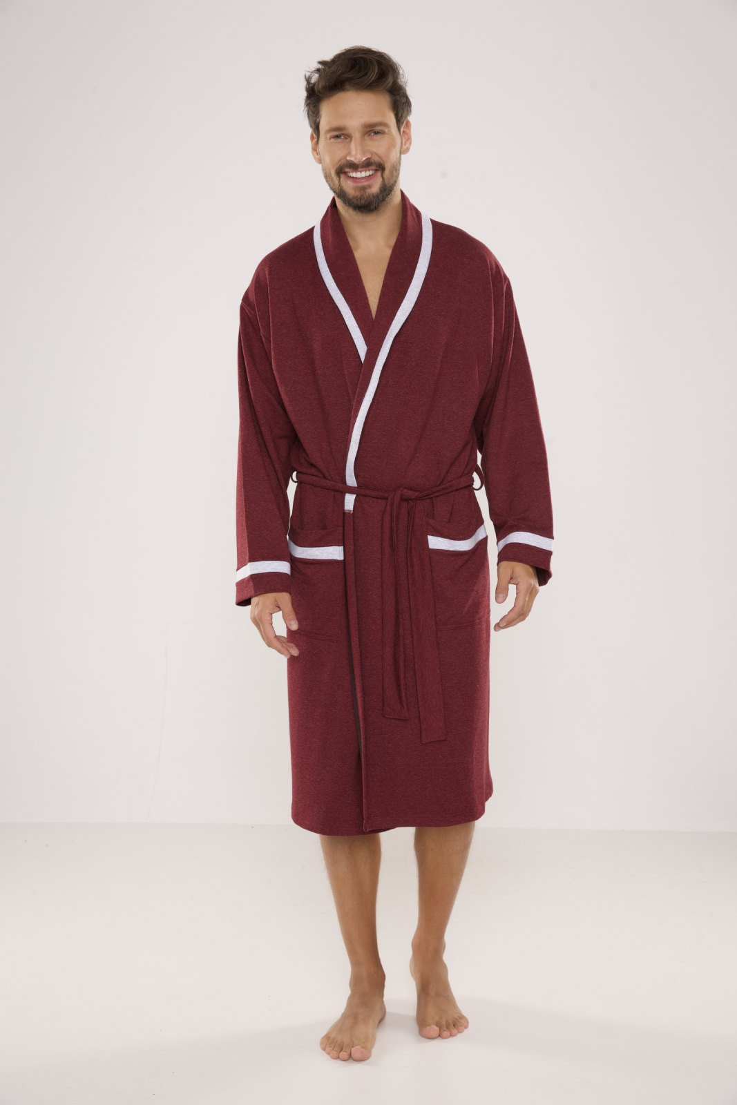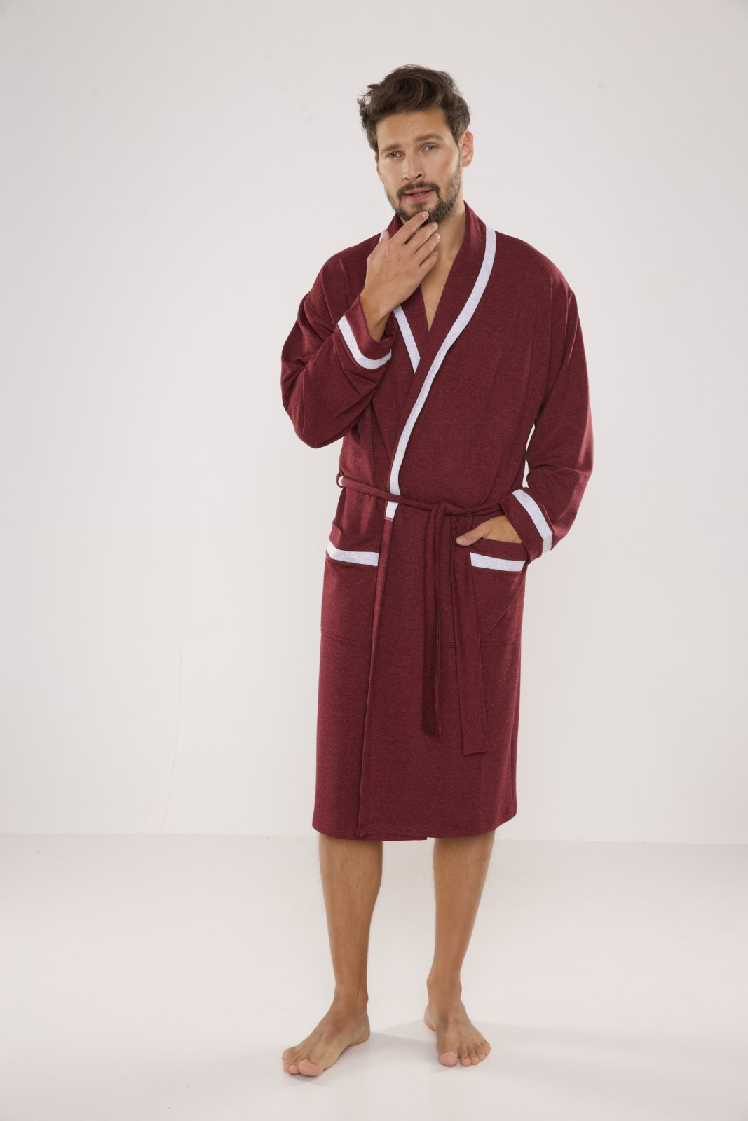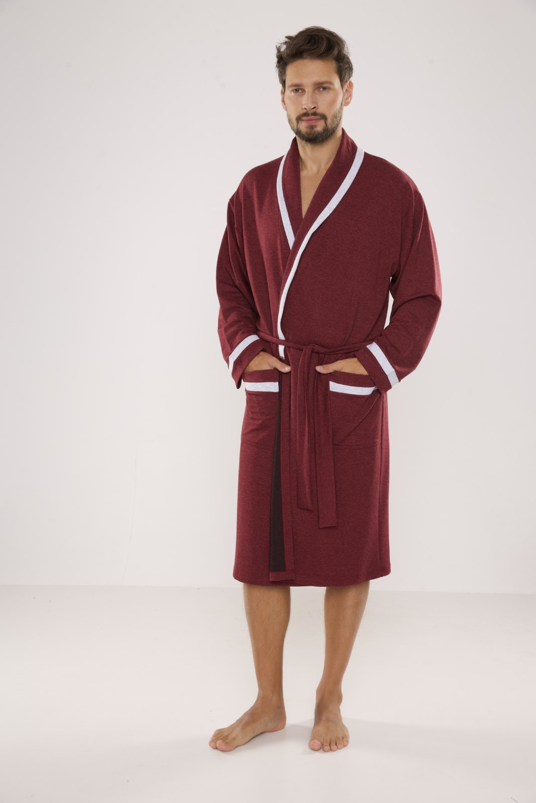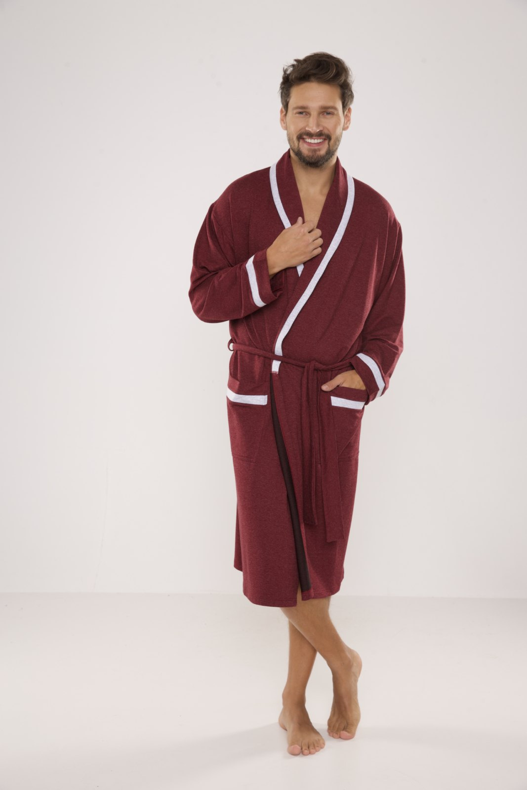 Elegancki szlafrok męski De Lafense - 564 Bruno. Szlafrok męski z kołnierzem, wiązany w pasie. Na linii bioder znajdują się kieszenie. Skład: 79% bawełna, 17% poliester, 4% elastan.Elegancki szlafrok męski De Lafense 564 Bruno to doskonały wybór dla mężczyzn, którzy cenią sobie nie tylko wygodę, ale także styl. Jego bordowy kolor wprowadza elegancję, a długi rękaw zapewnia komfort w każdej sytuacji. Dzięki zwyczajowi noszenia szlafroków, można poczuć się swobodnie i luksusowo, zarówno podczas porannych rytuałów, jak i wieczornych relaksów.
