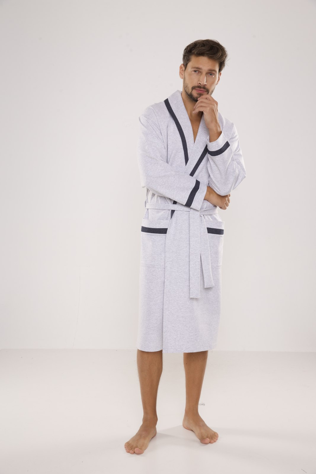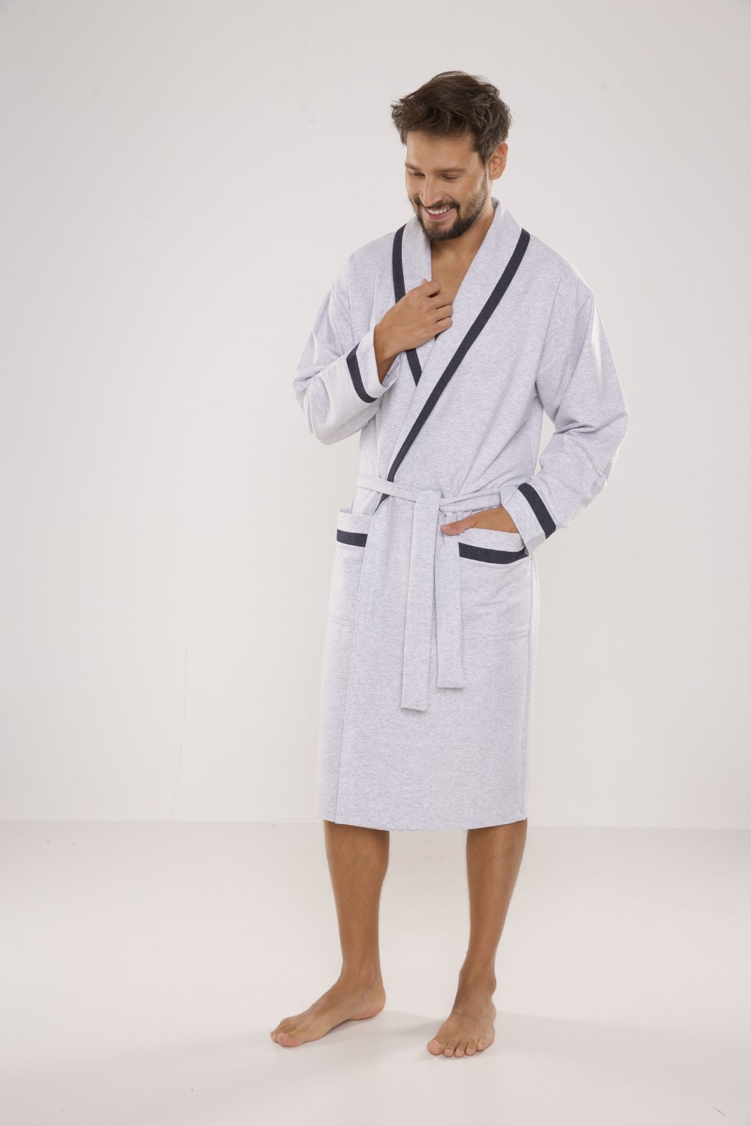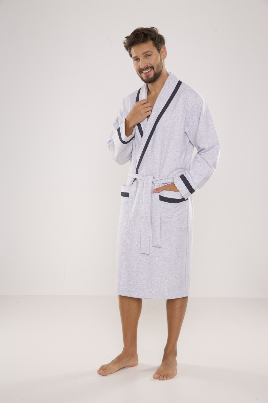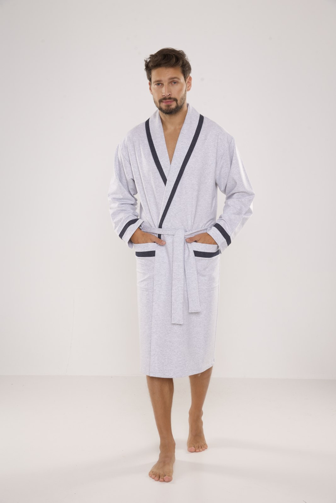 - Rodzaj: Długi szlafrok z wiązaniem - perfekcyjnie dopasowuje się do sylwetki, podkreślając męską elegancję i swobodę ruchów.