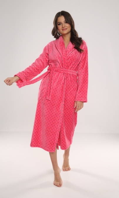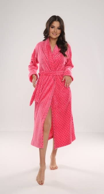 - Wygodny szlafrok damski z miłego materiału typu soft zdobionego wzorem w kropki.