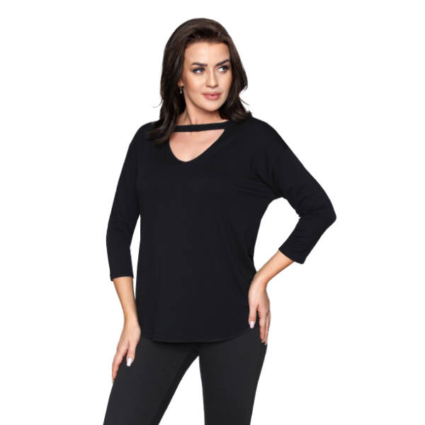Koszulka z rękawkiem 7/8, z delikatnej, przewiewnej wiskozy. Gładka, damska bluzka o luźnym kroju, miękko układa się na ciele. Dekolt w szpic, ozdobiony paskiem przy szyi nadaje dodatkowego szyku i elegancji. Skład: 94%wiskoza 6%elastanWitaj w świecie elegancji i komfortu! Oto bluzka damska Babell ALEXA, która łączy w sobie klasykę z nowoczesnym stylem. Kolor czarny sprawia, że jest to element garderoby, który nigdy nie wychodzi z mody.