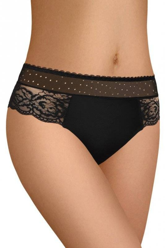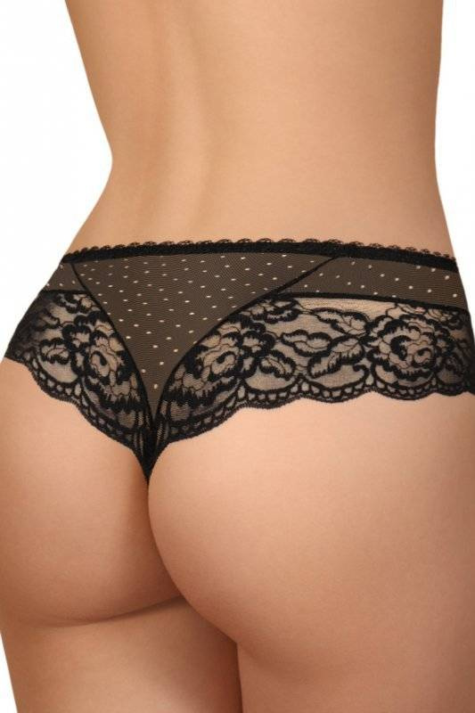 Wygodne stringi damskie wykonane z przyjemnego materiału. Model ozdobiony uroczym wzorem w groszki i ażurową koronką. Skład: 85% poliamid, 15% elastan.Szczegółowe dane