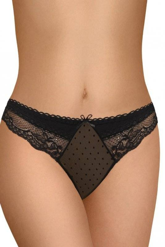 Wygodne koronkowe stringi damskie. Model ozdobiony ażurową koronką i delikatnymi kropkami z przodu. Subtelna kokardka z przodu i tyłu. Skład: 85% poliamid, 15% elastan.Szczegółowe dane