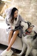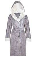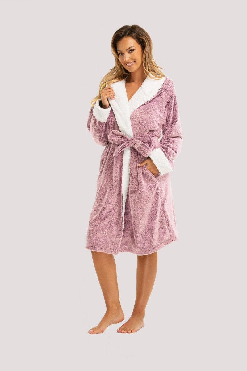 - Klasyczny wiązany szlafrok z przytulnej dzianiny, z wywijanymi rękawami w kontrastowym kolorze.