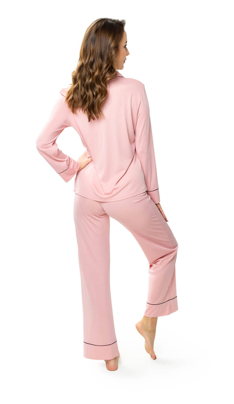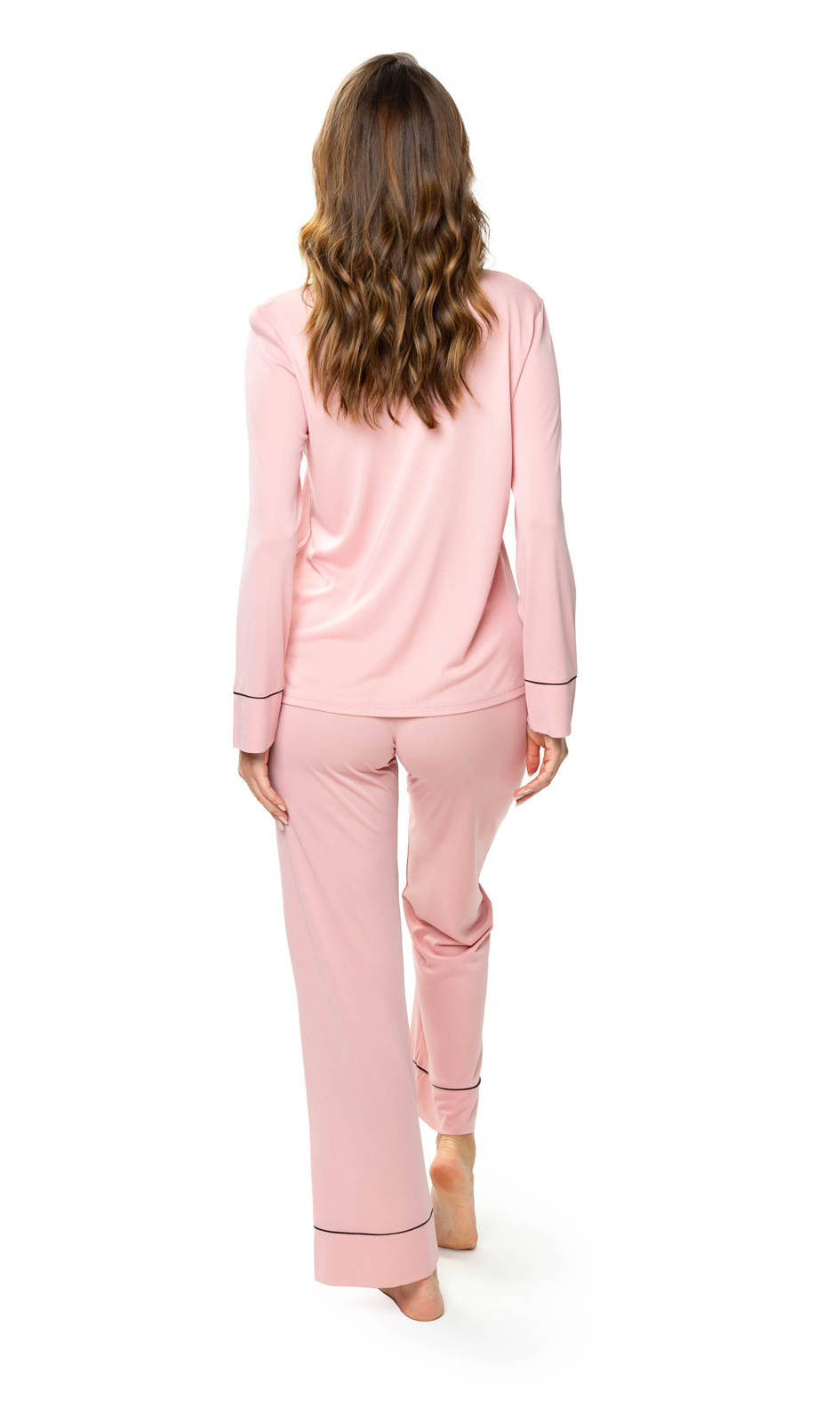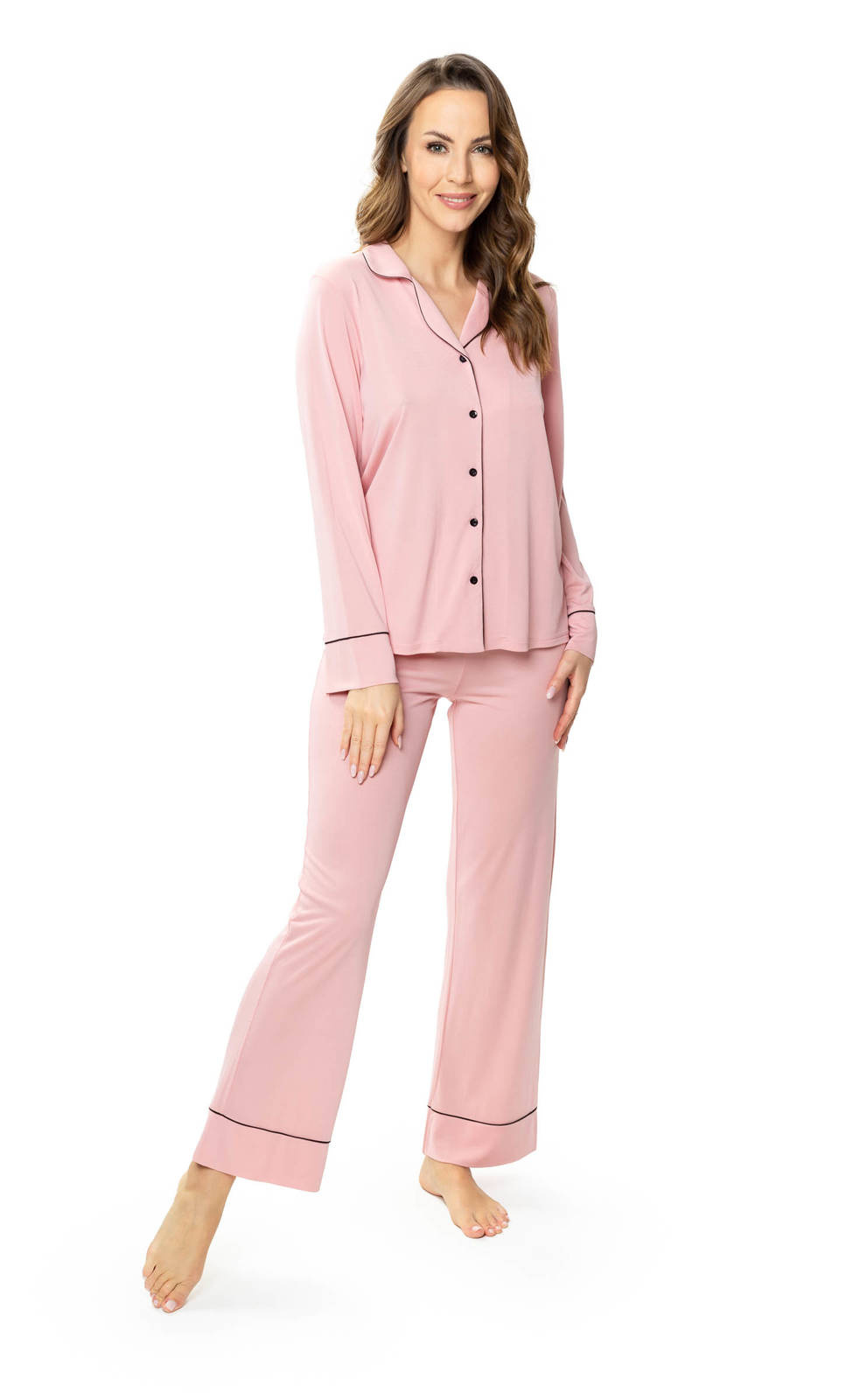 Model 86562-ELLITE-róż wyróżnia się dwuczęściowym kompletem, składającym się z rozpinanej bluzki na guziki oraz długich spodni. Piżama damska rozpinana posiada elegancki dekolt w kształcie szpica, co dodaje jej klasy i szyku. Długi rękaw sprawia, że jest to idealna propozycja dla kobiet, które preferują bardziej zabudowane kreacje na noc.