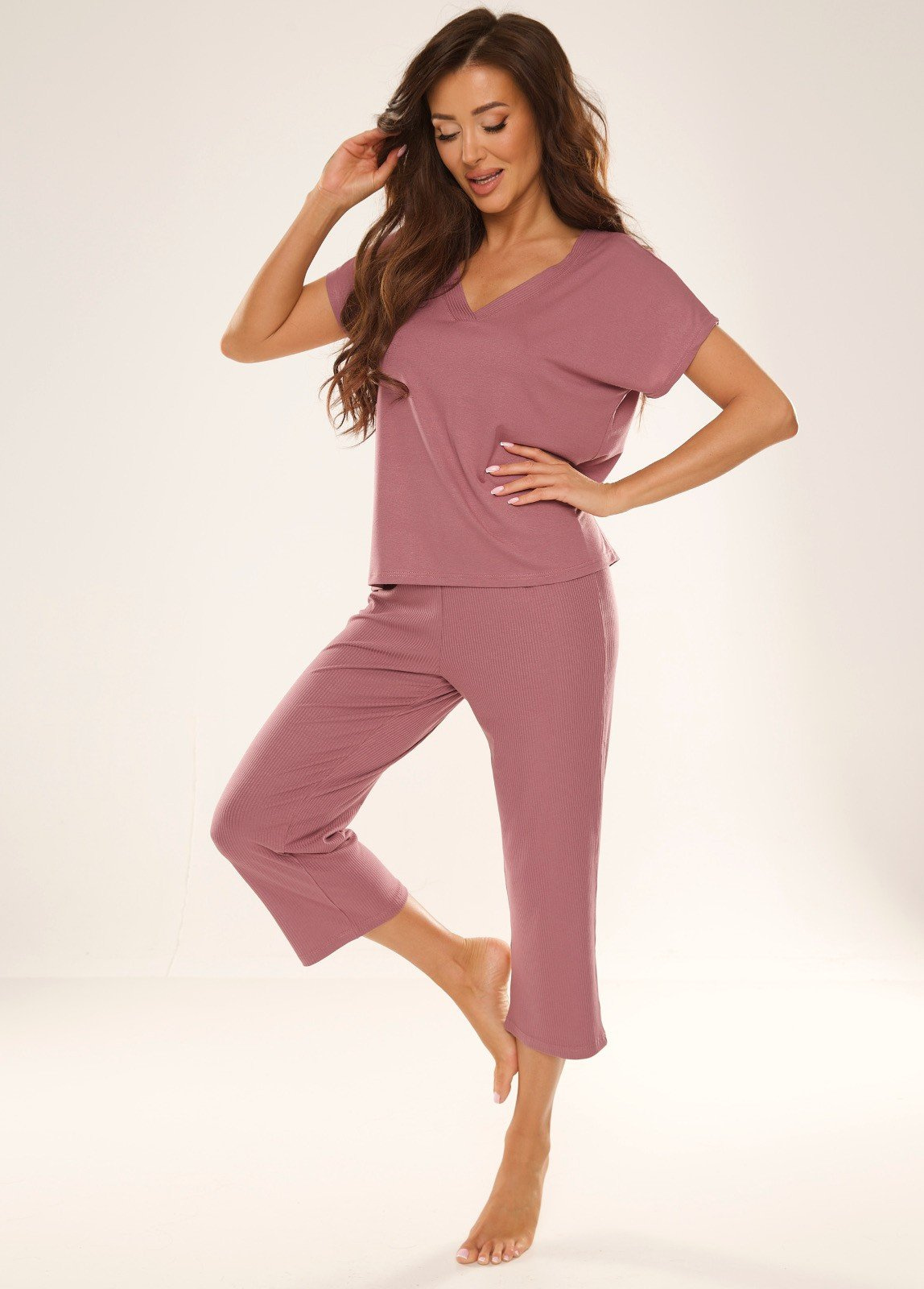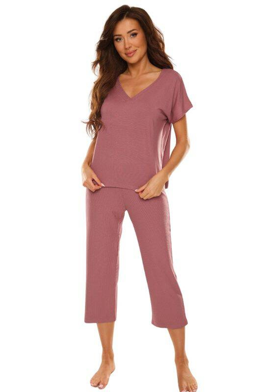 - Wygoda, jednokolorowa piżama damska na krótki rękaw. Piżama o luźnym fasownie z dekoltem w literę V.
