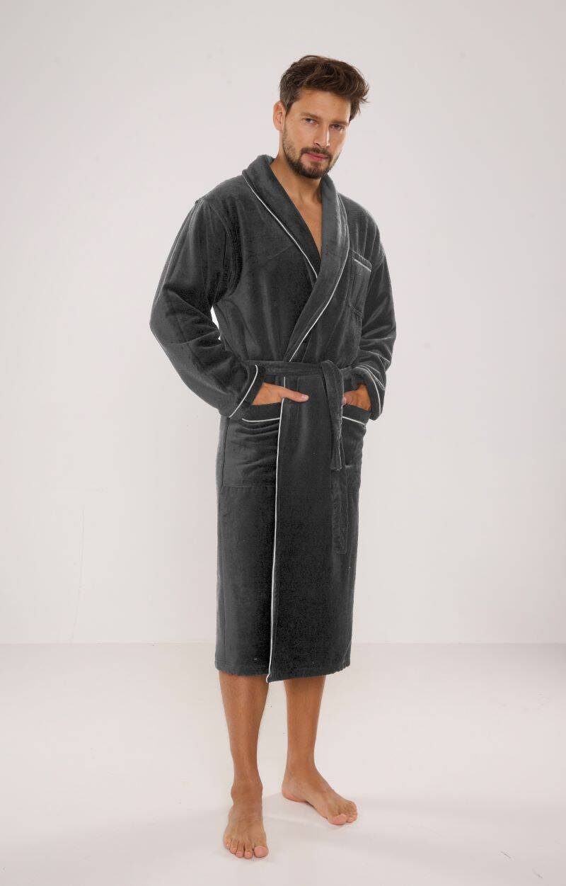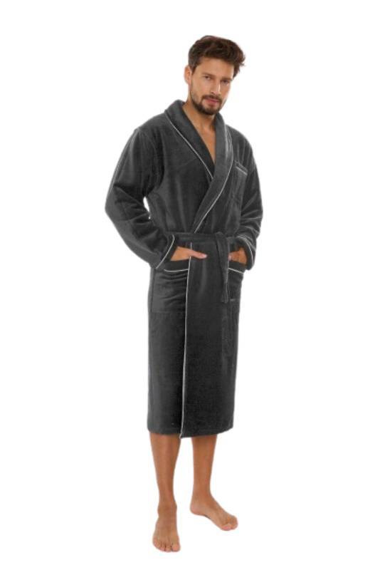 Grafitowy kolor szlafroka to panujący obecnie trend w modzie męskiej, który doskonale sprawdzi się w każdej sytuacji. Elegancki kołnierz oraz gładka struktura materiału nadają zjawiskowego charakteru, dzięki któremu szlafrok może być idealnym rozwiązaniem zarówno na relaks w domowym zaciszu, jak i jako prezent dla bliskiej osoby. Jego elegancki wygląd sprawia, że z powodzeniem można go nosić nawet podczas porannych wizyt w domowej strefie relaksu.