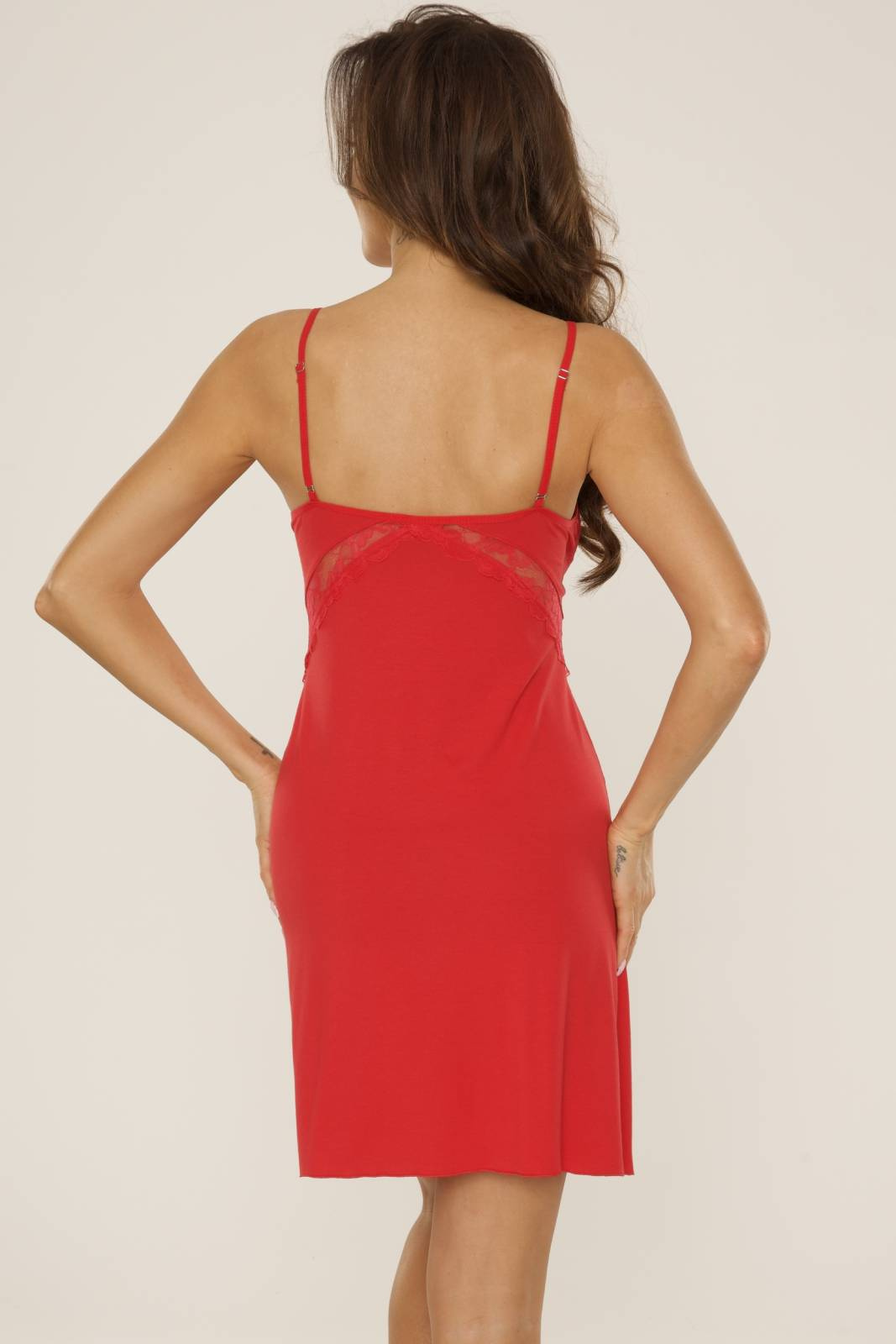 - Koszula nocna na ramiączkach uszyta z wysokogatunkowej wiskozy. Ozdobiona przy biuście koronką.