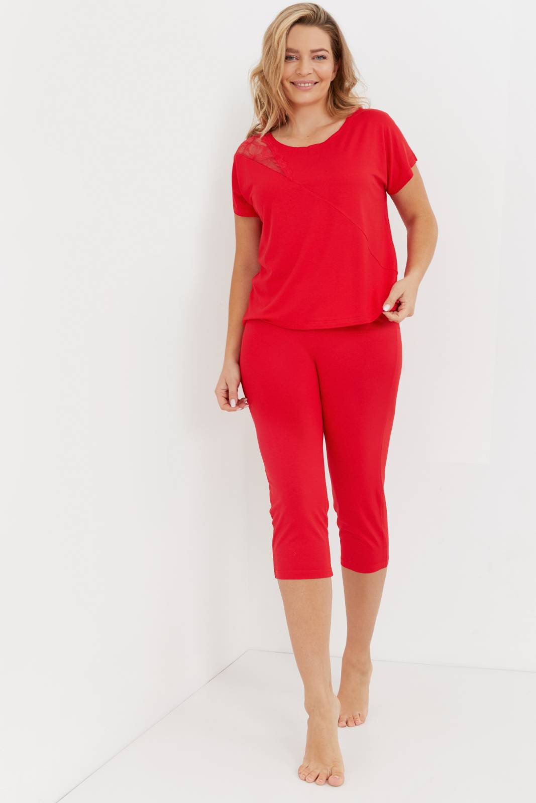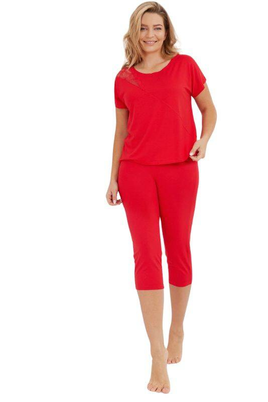 - Kobieca piżama dwuczęściowa w czerwonym kolorze. Piżama damska uszyta z przewiewnej wiskozy.