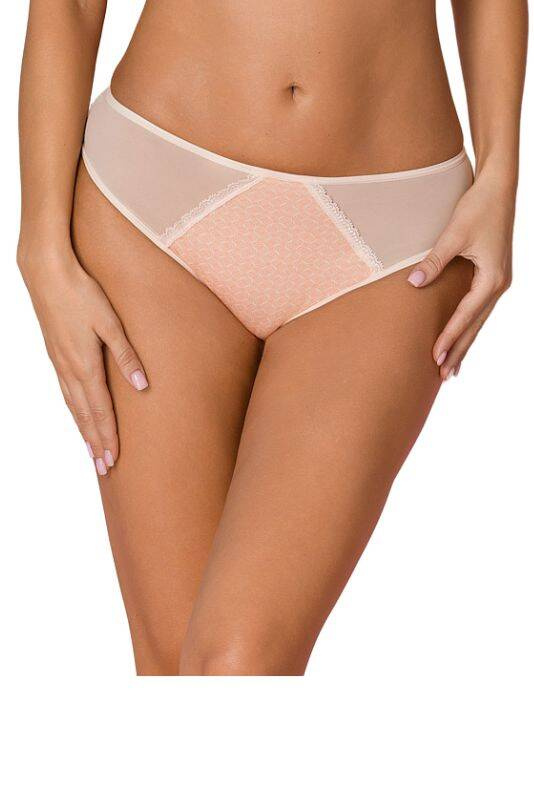 - Klasyczne figi damskie w kolorze brzoskwiniowym z tiulowym wykończeniem. Tył wykonany z elastycznego tiulu.