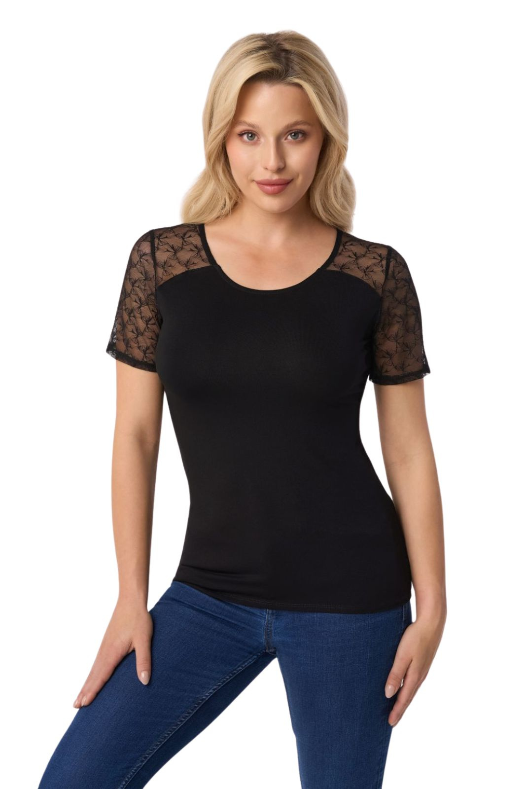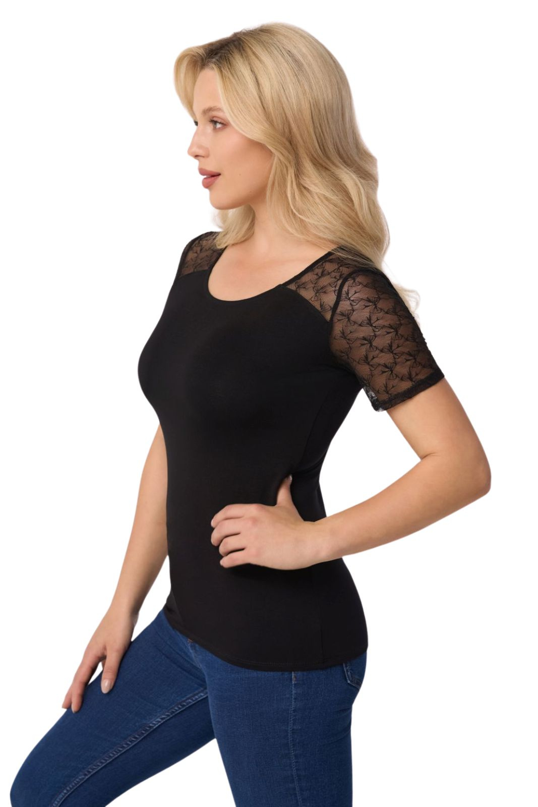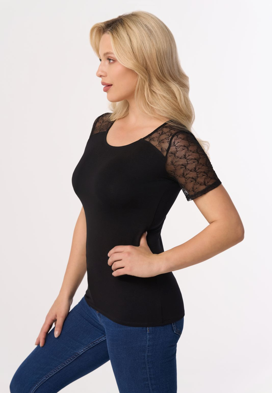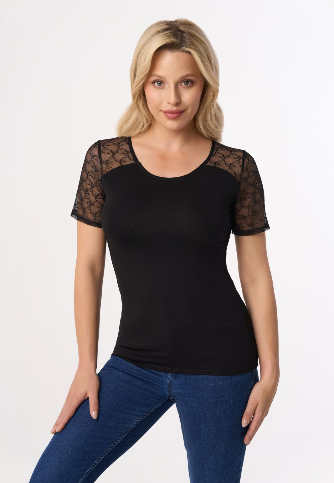 - Czarna bluzka damska z koronkowymi rękawami. Przód i tył wykonane z wiskozowego gładkiego materiału.