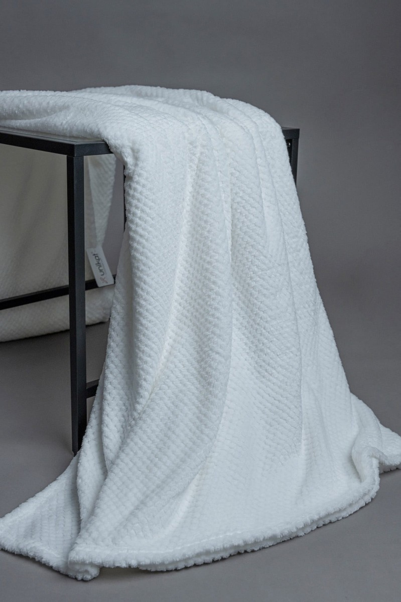 - Miękki i przytulny koc w białym kolorze. Koc o wymiarach 160x200. Idealny na chłodne wieczory oraz jako narzuta na łóżko.