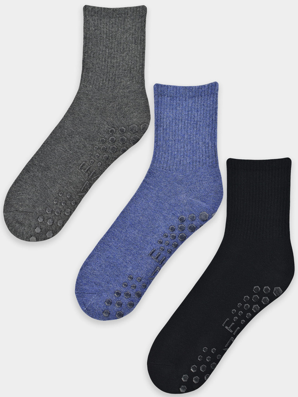 - Wygodne bawełniane skarpety z antypoślizgową podeszwą. W paczce 6 sztuk w 3 stonowanych kolorach: czarny, szary, niebieski.